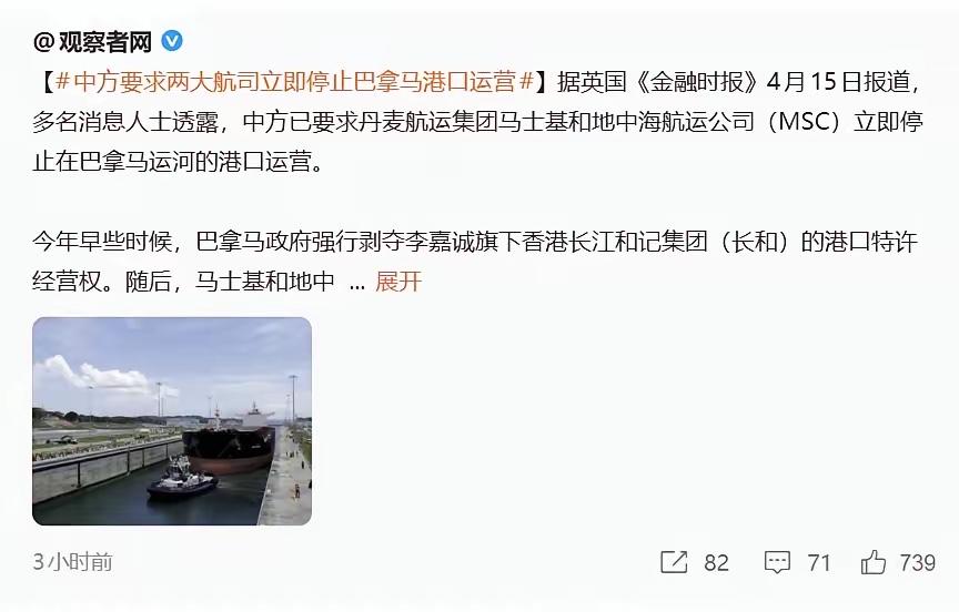 没有半点毛病。据英国《金融时报》4月15日援引多名消息人士的话报道,中方已要求丹麦航运集团马士基和地中海航运公司(MSC)立即停止在巴拿马运河的港口运营。而马士基和地中海航运公司在与中方的沟通中辩称,他们的临时特许经营权对于保持巴拿马运河贸易畅通至关重要。 这话听起来没毛病,但细想不对劲。巴拿马政府今年1月强行抢了长和集团经营了近30年的港口,转头就给了这两家欧洲公司。这哪是“临时过渡”?分明是趁火打劫。 长和当年可是通过公开招标拿下的合同,累计投了18亿美元真金白银。巴拿马那时候一声不吭,钱投完了、港口现代化了,美国一施压就翻脸说“违宪”?这宪法是昨天刚改的吧。 特朗普急着要“收回巴拿马运河影响力”,巴拿马就乖乖听话。欧洲两大航运巨头接盘,美国在背后笑得合不拢嘴。这套剧本写得挺顺,可惜中国不按你的套路演。 中国这次态度很硬。发改委直接召见马士基和MSC高层,话撂得很明白:立即退出,别干损害中国企业利益的事。不是商量,是通知。 马士基CEO柯文胜3月20日跑到北京跟发改委官员见面。MSC总裁迭戈·阿蓬特靠书面信函沟通。两家都没敢拍桌子说“不”,只敢弱弱辩一句“我们是为了贸易畅通”。 贸易畅通?长和干了28年,港口吞吐量全球领先,怎么就妨碍贸易畅通了?巴拿马法院判了不到24小时,政府就派人强行接管码头,连人家办公桌都占了。这叫维护畅通? 中国这回不跟你玩虚的。4月份刚出台《国务院关于产业链供应链安全的规定》,直接把“损害国家产业和供应链安全”定为非法。紧接着《反外国不当域外管辖条例》出炉,谁敢配合外国打压中国企业,就上实体清单。 法律工具箱一打开,条条都是实招。不是嘴上抗议,是真有反制手段。马士基和MSC在中国市场有多大业务?自己掂量掂量。 长和已经把索赔金额提到20亿美元以上。国际仲裁同时告巴拿马政府和马士基。这不是小数目,够巴拿马喝一壶的。 巴拿马外长前脚骂中国“不尊重主权”,总统后脚就说“希望局势降温”。这脸变得比翻书还快。自己心里没鬼,慌什么? 美国在背后撑腰又怎样?中国远洋海运集团3月已经暂停在巴尔博亚港的业务。你有张良计,我有过墙梯。全球供应链不是谁一家说了算。 马士基辩称“临时经营权对贸易畅通至关重要”,这话说反了。真正威胁贸易畅通的,是这种政治操弄下的强行接管。今天能抢长和的,明天就能抢你的。 巴拿马运河承载全球5%的海上贸易量。这条黄金水道的港口经营权,不是谁临时占一下就能算数的。中国企业在里面投了18亿美元,你说拿走就拿走? 特朗普施压,巴拿马照做,欧洲公司接盘,美国资本在后面笑。这套组合拳打下来,谁吃亏了?长和亏了20亿美元,巴拿马亏了国家信誉,欧洲公司被架在火上烤。 只有美国稳赚不赔。既打压了中国企业,又没脏自己的手。可这招用过太多次了,大家不瞎。 中方的态度很明确:一切必要措施,坚决维护企业正当权益。这不是空话,是已经开始动手了。马士基和MSC最好想清楚,在中国市场的生意还要不要做。 巴拿马也别忙着“找补”了。你配合美国演这出戏,最后能捞到什么?中国企业走了,美国资本进来,你连讨价还价的余地都没有。历史教训就在眼前。 这场博弈还没完。中国手里牌不少:全球最大市场、完整产业链、法律反制工具。谁想在中国企业头上动土,先掂量掂量后果。 各位读者你们怎么看?欢迎在评论区讨论。