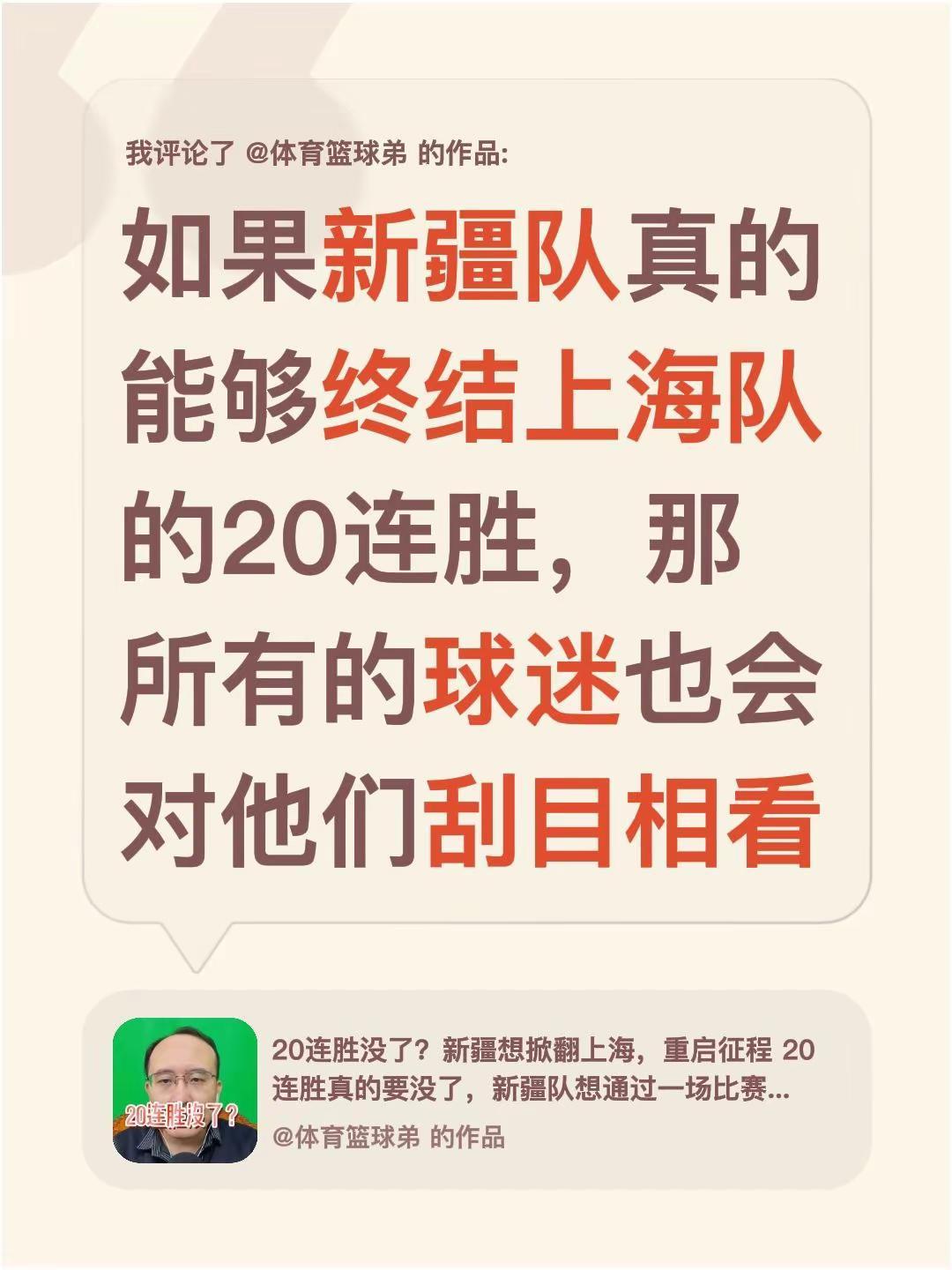 我评论了@体育篮球弟 的作品:如果新疆队真的能够终结上海队的20连胜,那所有的球迷也会对他们刮目相看