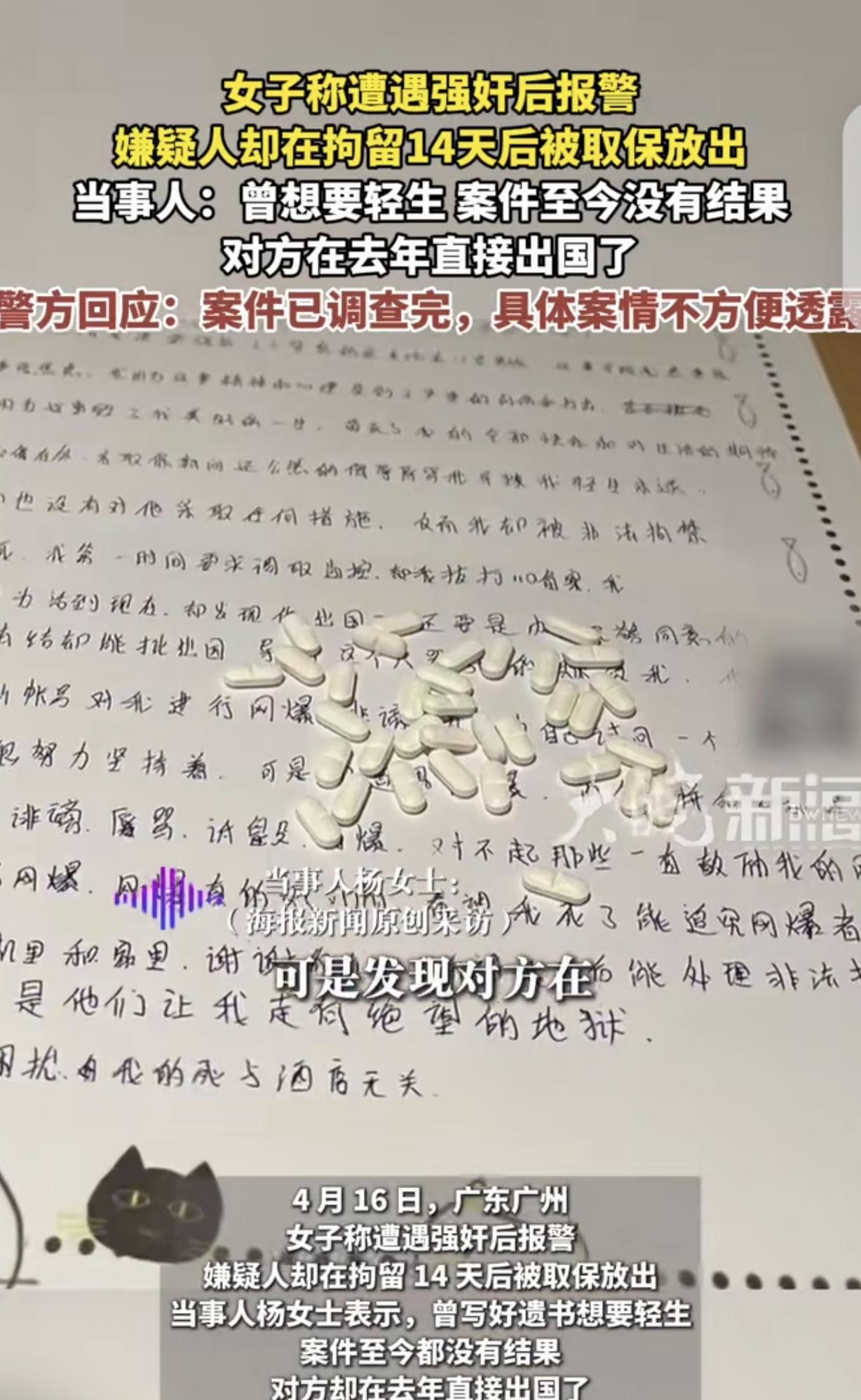 广东广州,一女子被男子侵犯,她报警后,男子被拘留14天后,竟取保放出来了,女子崩溃,她无法接受,写下遗书想要轻生,可男子毫发无损的出国了,3年过去了,案子都没结果。女子绝望了。 杨女士被家人从鬼门关拉了回来,当时她留好了遗书,就想一了百了,谁劝都没用。 也不怪杨女士想不开,她被人毁了清白,受到了侮辱,折腾了3年的案子到如今没个结果。 当初侵犯她的人早就逍遥自在出了国,换谁也扛不住这种屈辱? 这事得从2023年6月说起,那天晚上杨女士被一名男子侵犯,她第一时间就报了警。 警方很快把人抓了,当时杨女士还觉得总算能讨个公道,希望男子被绳之以法,得到应有的惩罚。 可没想到,他被拘留14天后,竟然办了取保候审,直接被放了出来。 杨女士接到通知的时候,整个人都懵了,她怎么也想不通,证据确凿的事,怎么就能把人放了。 更让她崩溃的还在后面,她到处打听才知道,那男子被放出来没多久,就办了签证出了国,连人影都找不到了。 这3年来,杨女士跑了无数次,都没结果。 她每天都活在痛苦里,白天不敢出门,晚上一闭眼就想起当时的场景,朋友也不敢联系,整个人瘦得只剩皮包骨头,每天活在痛苦,恐惧,折磨里。 家里人看着她越来越不对劲,轮番劝她想开点,可林女士心里的坎根本过不去。 明明自己是受害者,反倒像做错事的人一样躲躲藏藏,施暴者却在国外过得逍遥自在,换谁能咽下这口气? 那天她趁着家人出门买东西,锁了门写下遗书,幸好家人回来得早,把门撞开把她送了医院,才没酿成悲剧。 如今,杨女士的身体慢慢养好了点,但她心里的伤害无法痊愈。 只要一提起这件事,她眼泪还是止不住往下掉。她还是在坚持跑案子,就想等着那男子回国,能把他绳之以法。 很多人劝她算了,都过去这么久了,可杨女士说,只要自己还活着,就不可能算了,总得给受害者一个公道。 警方的回复是,案件已调查完,具体不方便透露。 这事也让很多人觉得唏嘘,遇到这种事,受害者本来就已经承受了巨大的痛苦,要是维护权益的路再堵得死死的,真的能把人逼上绝路。 这事搁谁身上都得垮。你说受害者没做错任何事,反而要躲在家里不敢见人。 而施暴者犯了罪,反倒拍拍屁股出国潇洒,连追责都追不上,这换谁能平衡? 最让人难受的是,维护权益这条路走了3年,连个准信都没有,普通人哪耗得起这时间和精力啊? 总不能让人钻了“跑出国就没事”的空子,不然以后受害者的权益谁来保障? 不能让守法的人受委屈,违法的人躲逃避制裁,这是最基本的道理。 《刑法》第10条规定:凡在中华人民共和国领域外犯罪,依照本法应当负刑事责任的,虽然经过外国审判,仍然可以依照本法追究,但是在外国已经受过刑罚处罚的,可以免除或者减轻处罚。 本案中施暴者虽已逃往国外,但我国司法管辖权不受影响,一旦其归国或被引渡回国,依然可以依法对其追究刑事责任,不会因出境就逃脱法律制裁。 对此,你怎么看?
