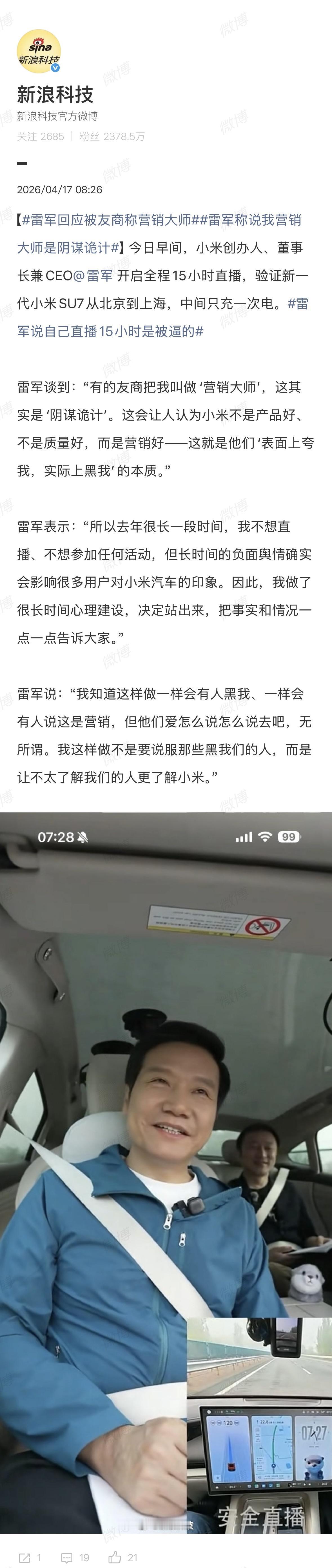 “有的友商把我叫做“营销大师”,这其实是阴谋诡计。这会让人认为小米不是产品好、不是质量好,而是营销好——这就是他们表面上夸我,实际上黑我的本质。” 营销本来是个中性词,这几年网上谈到这个词语,很多时候有点像是贬义词[吃瓜群众]