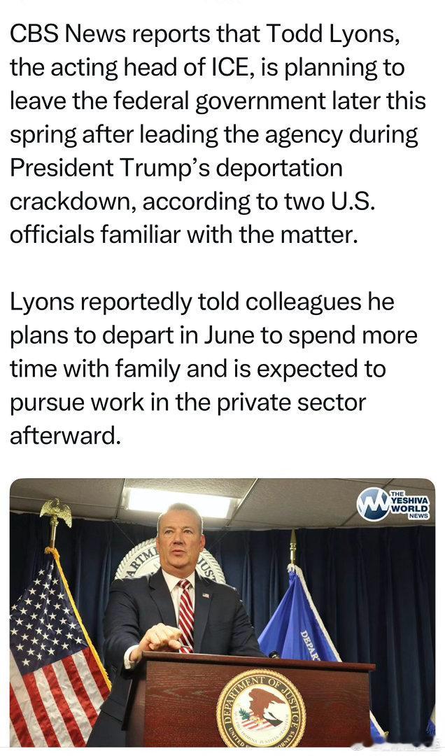移民执法(ICE)负责人今天辞职