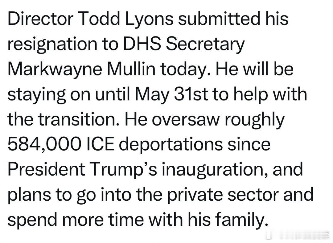 移民执法(ICE)负责人今天辞职理由是“多和家人在一起”以及“进私企”任内驱逐出