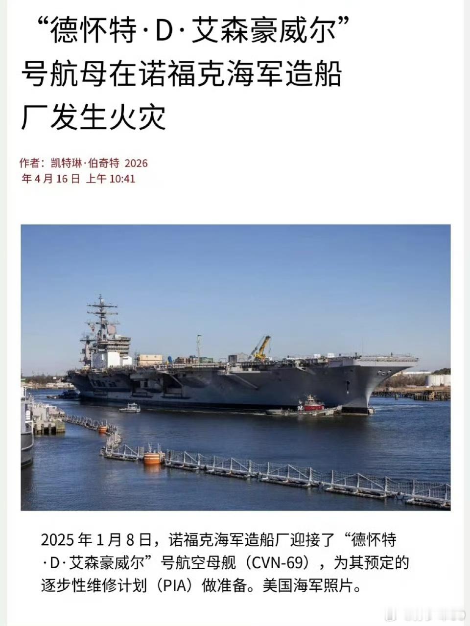 “德怀特·D·艾森豪威尔”号航母在诺福克海军造船厂发生火灾