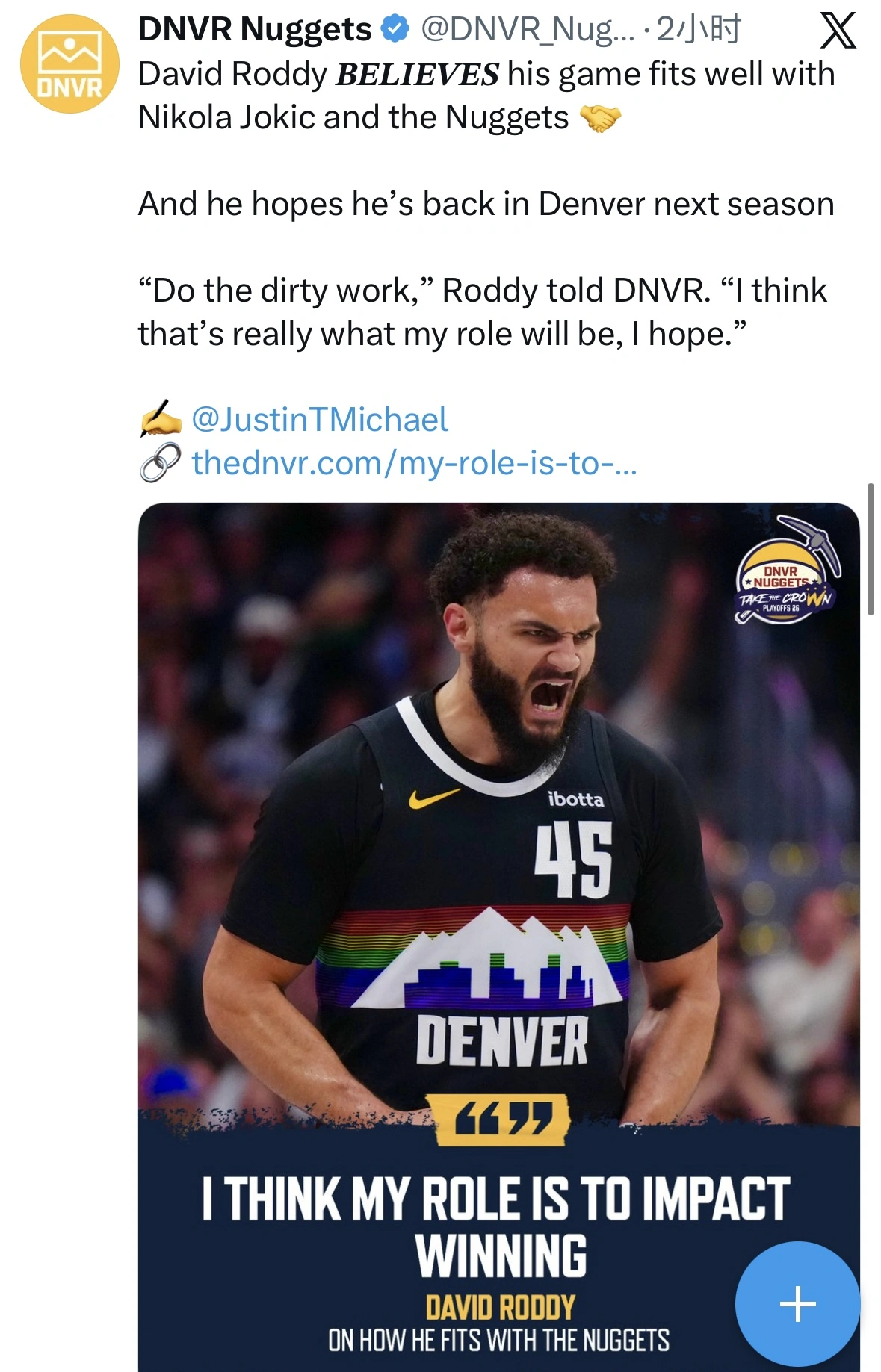 大卫·罗迪坚信自己的比赛风格和约基奇、以及掘金队完美适配,他也希望下赛季能继续留在丹佛掘金。