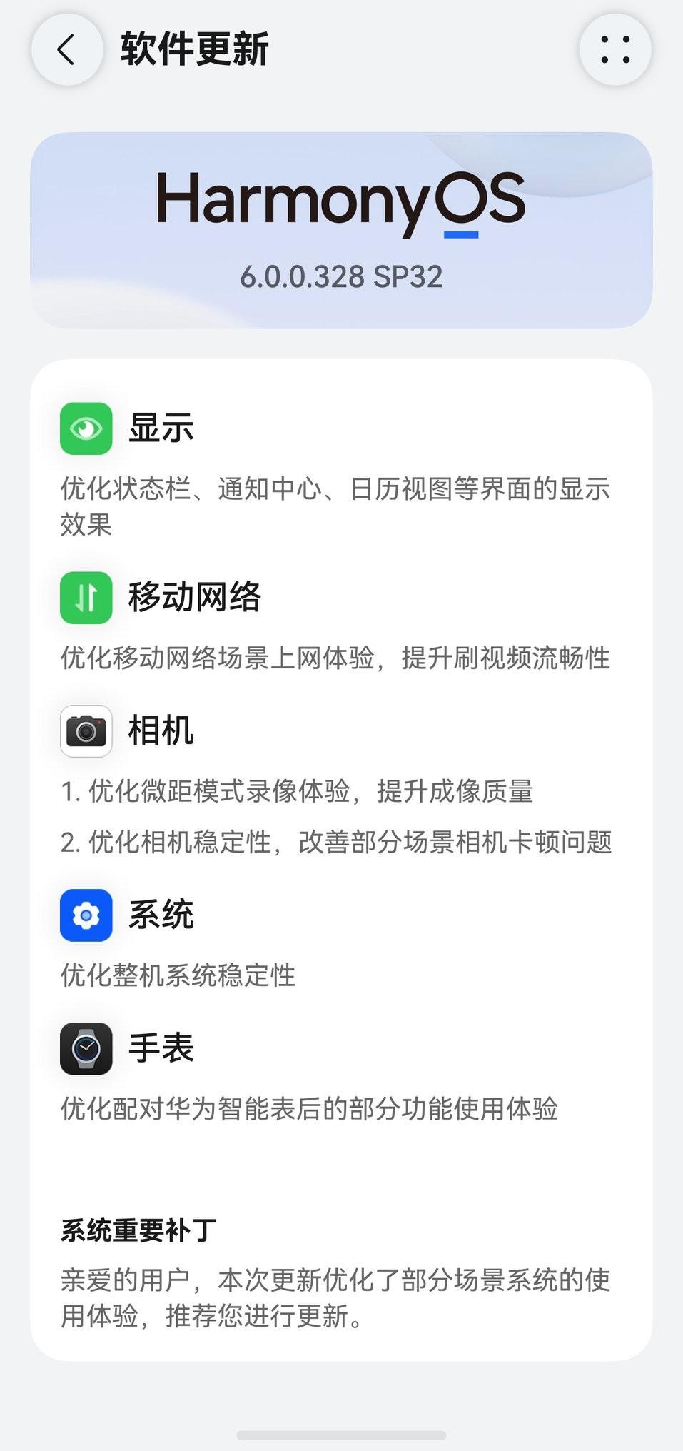 华为Pura 80 Ultra鸿蒙系统于今日推出更新,新版本(6.0.0.328 SP32)主要更新内容如下: 显示:对状态栏、通知中心、日历视图等界面的显示效果进行优化 移动网络:优化移动网络场景下的上网体验,增强刷视频的流畅性 相机: 1.优化微距模式的录像体验,提高成像质量 2.提升相机稳定性,改善部分场景下相机卡顿的问题 系统:优化整机系统的稳定性 手表:优化与华为智能表配对后的部分功能使用体验 系统重要补丁