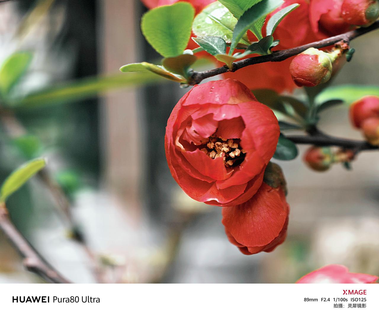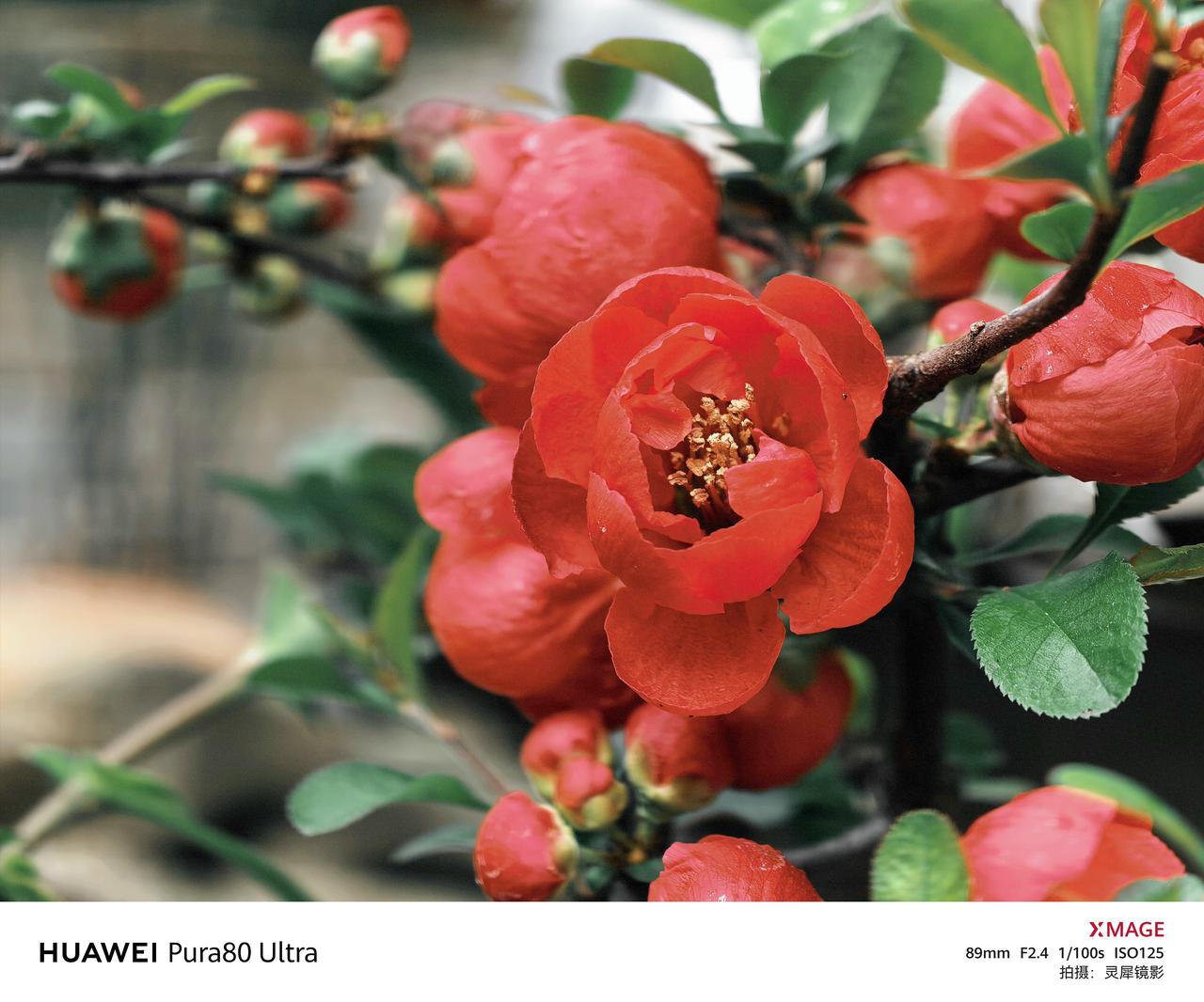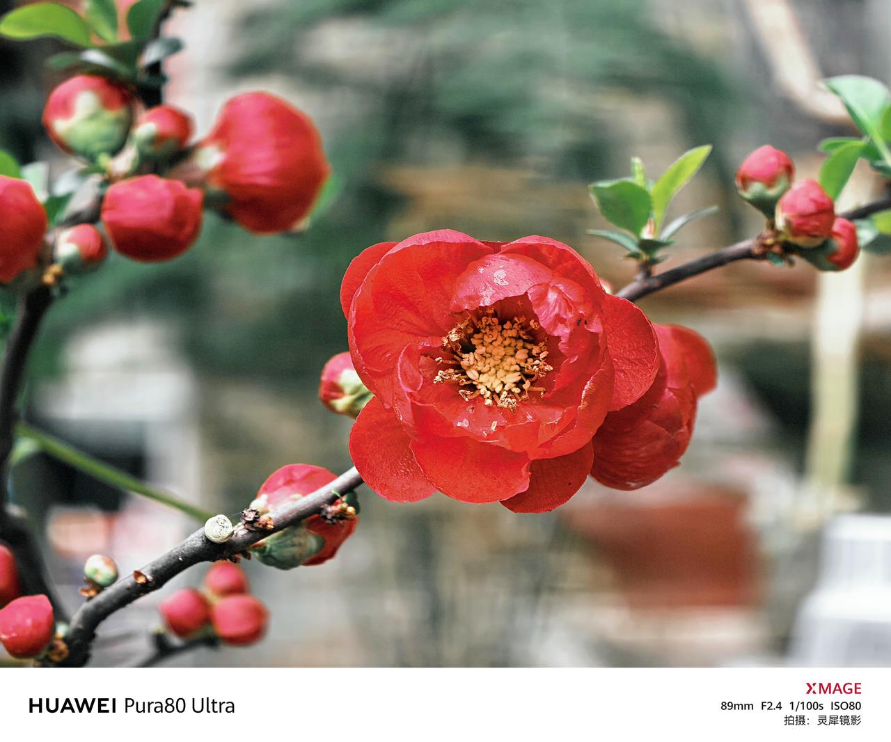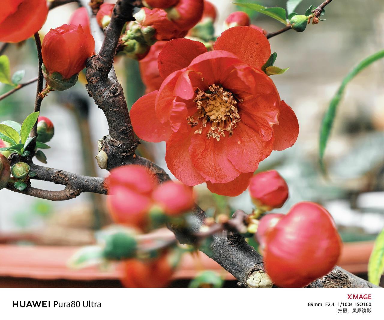 华为Pura 80 Ultra手机里春色:贴根海棠之美 贴梗海棠,宛如春日里的一抹惊艳。枝干苍劲,花朵簇拥,似火般热烈。其色艳丽而不俗,香幽而沁心。在微风中轻轻摇曳,仿若舞动的精灵,让人沉醉于这自然之美,感受生命的蓬勃与灵动。晒图笔记大赛 手机随手拍原创图片