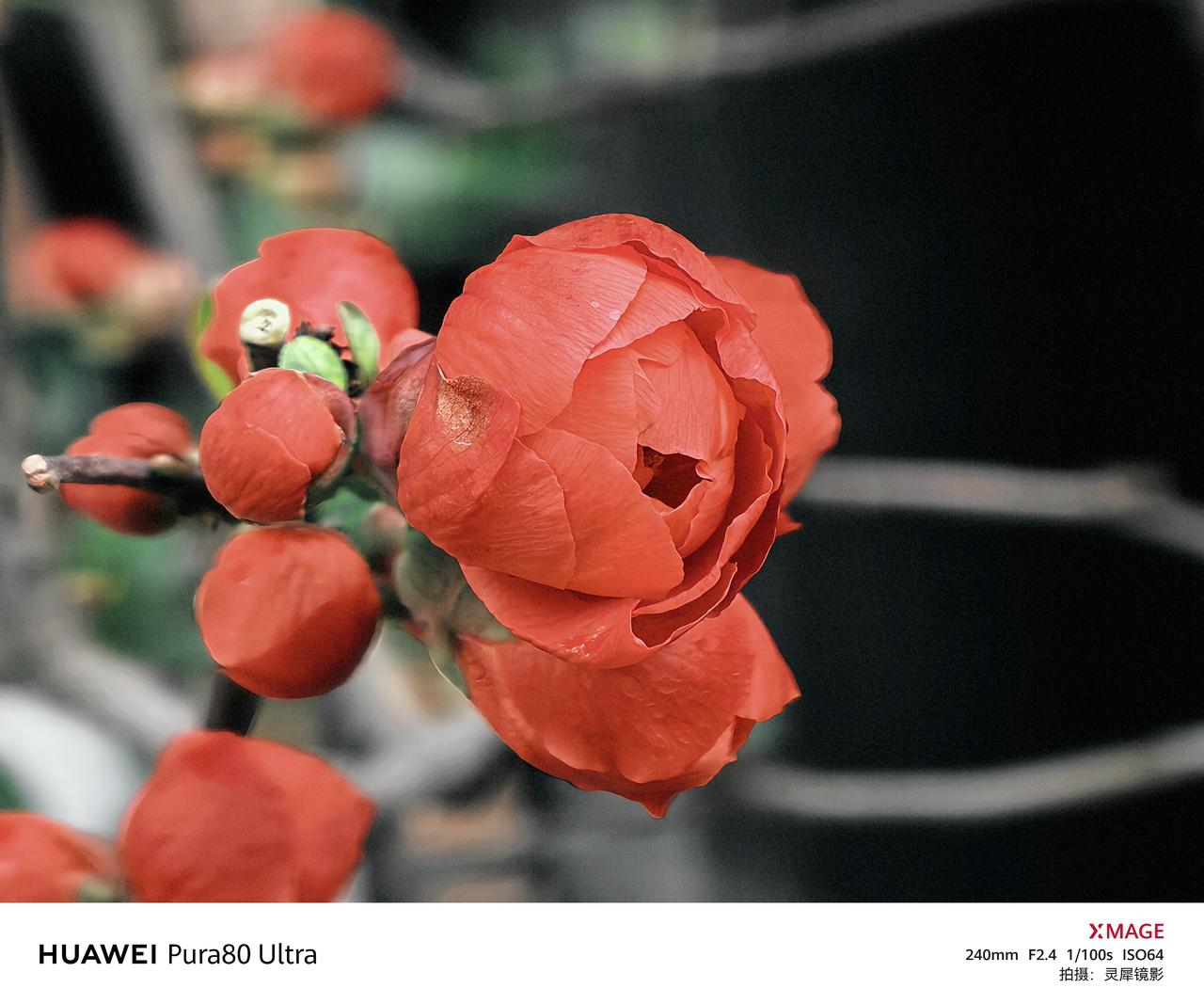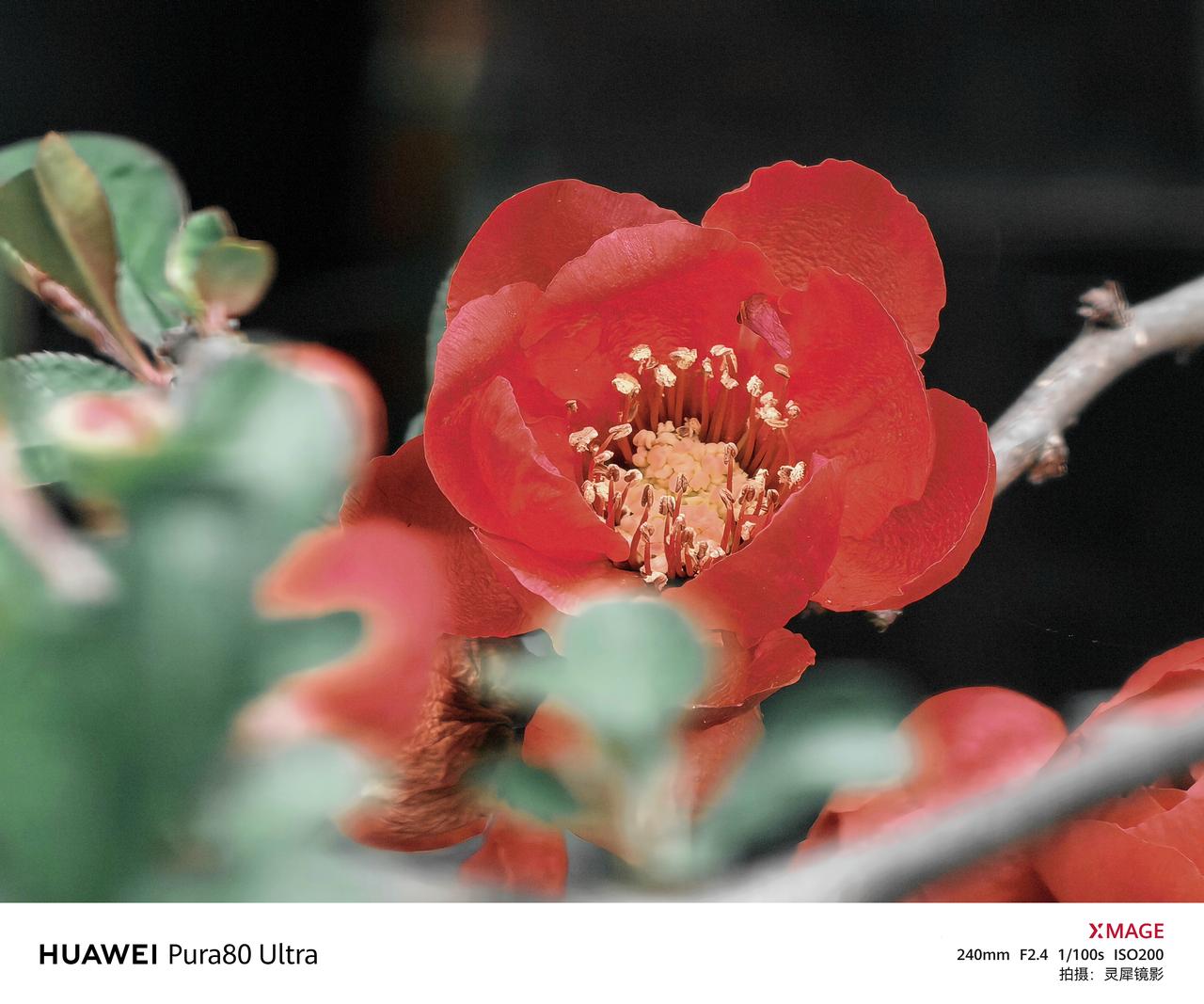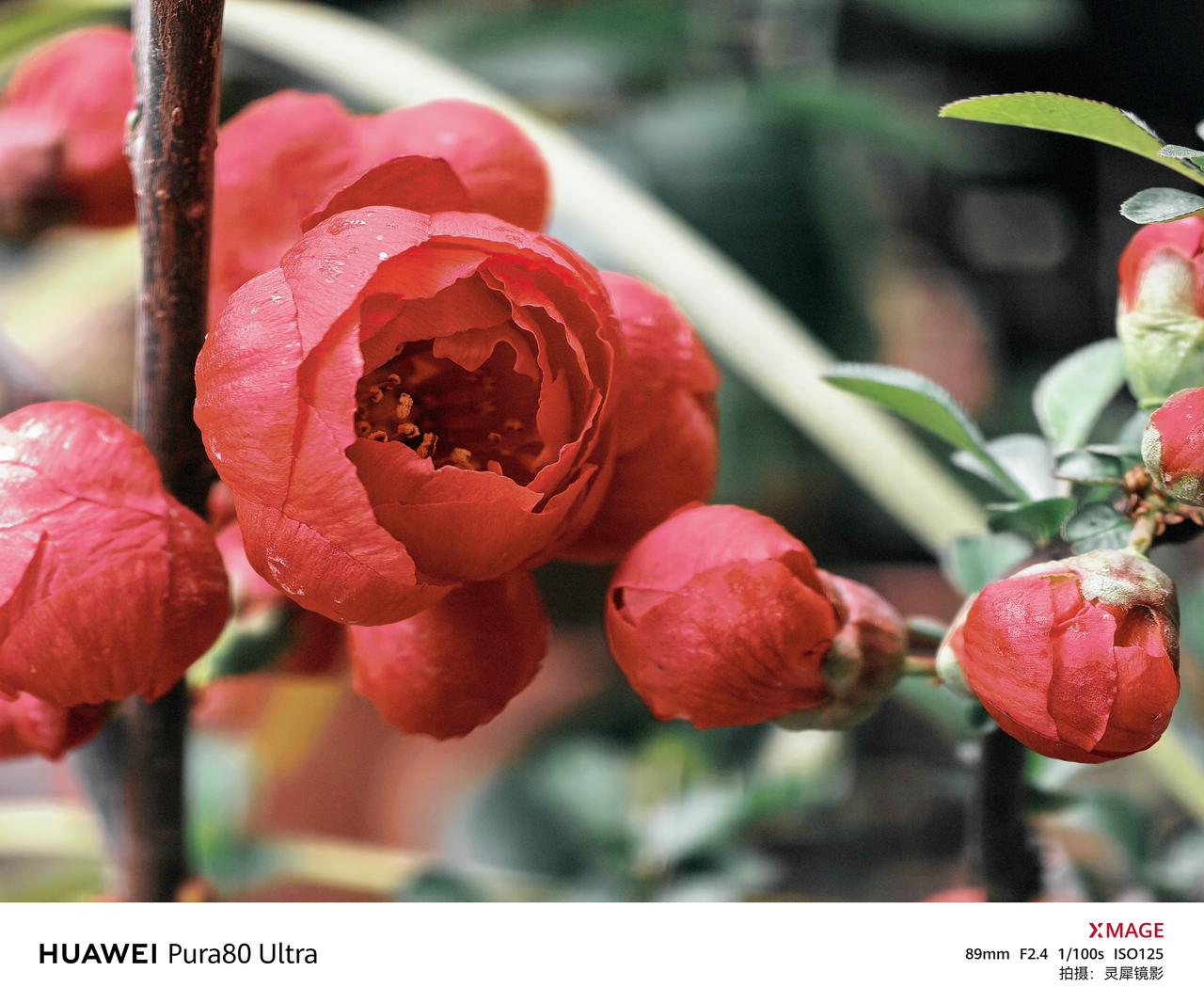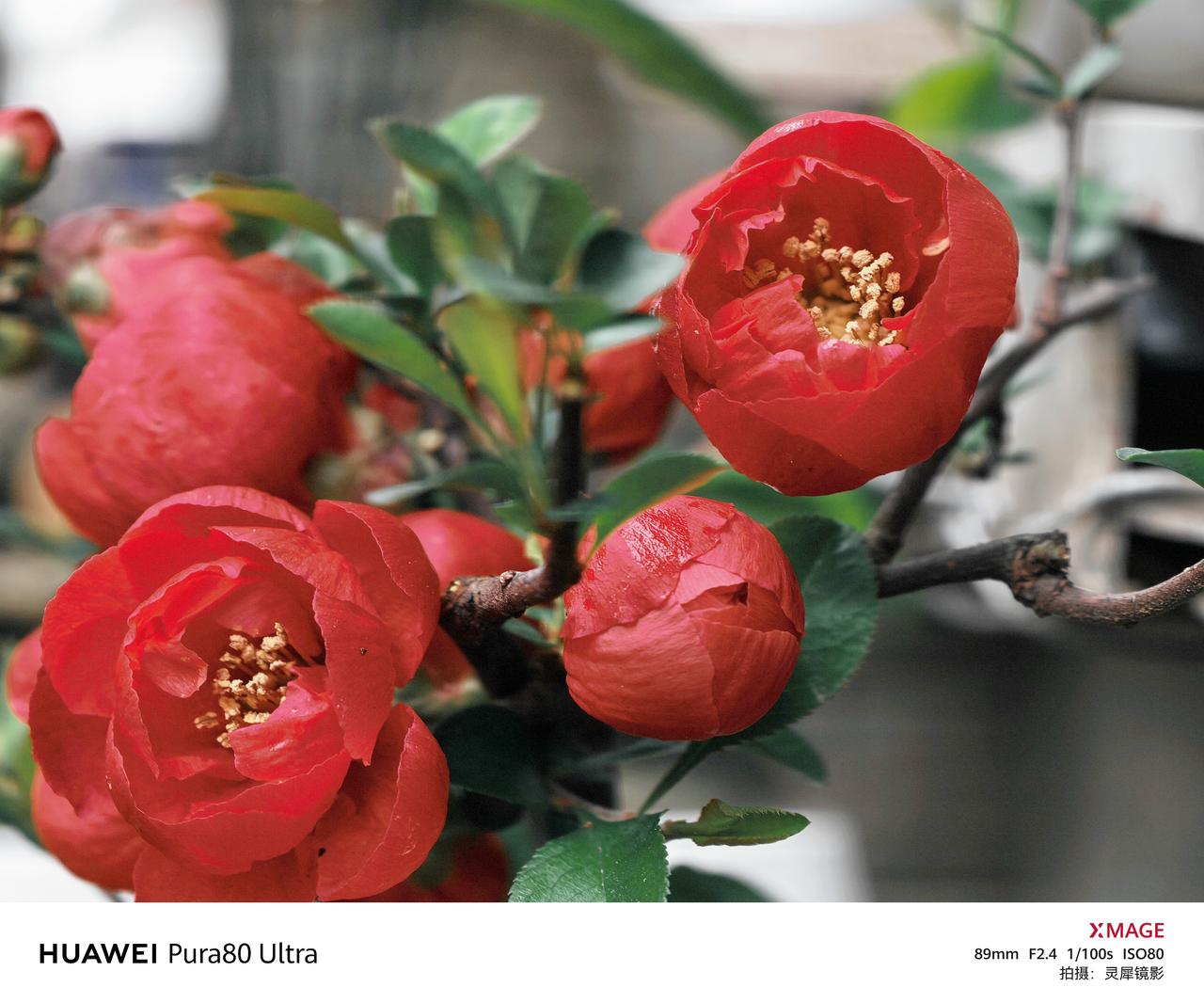 华为Pura 80 Ultra手机里春色:贴根海棠之美 贴梗海棠,宛如春日里的一抹惊艳。枝干苍劲,花朵簇拥,似火般热烈。其色艳丽而不俗,香幽而沁心。在微风中轻轻摇曳,仿若舞动的精灵,让人沉醉于这自然之美,感受生命的蓬勃与灵动。晒图笔记大赛 手机随手拍原创图片