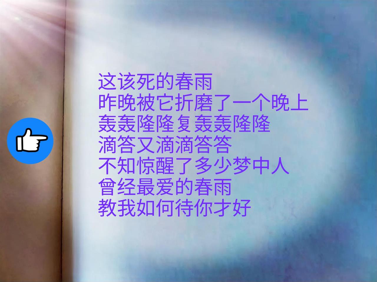 昨天晚上十一点钟,我们这里风雨大作,轰轰复轰轰,隆隆又隆隆,滴滴嗒嗒,滴滴嗒嗒,好大的雨啊!这场春雨,不知惊醒了多少梦中人呢?儿子从睡梦中被惊醒,大喊一声:妈妈,打雷了,我怕……然后赶紧跑到我的房间。 我连忙起床,给了儿子一个大大的拥抱,然后说了几句安抚他的话,接着他就乖乖回自己的房间上床继续睡觉。可上床后,他睡不着,还是很怕的样子。因为,雷声雨声和闪电还在持续,从11:00一直下到12:30,雨才慢慢变小。这个时候,我以为儿子可以安然入睡的呢。没想到他还是睡不着,因为窗外的闪电还是不断闪。 当我正要准备睡着的时候,儿子大叫一声:妈妈,窗外的闪电好刺眼,我睡不着。听到儿子这么说,我老公突然大声对儿子说:你睡你的觉,闪电关你什么事?你在屋内闪电又闪不到你,有什么好怕的?快睡觉! 儿子听到他老爸这么说就不敢出声了,我这个儿子啊,平时就怕他老爸,一点都不怕我,可能我和他老爸的教育方式不同吧! 他老爸的教育方式粗暴直白,我的教育方式温柔委婉,喜欢和儿子慢慢讲道理什么的。 突然我明白了一个道理,教育孩子有时候真的不是只讲讲道理这么简单,要两结合才行。从昨天晚上的事来看,我的教育方式和我老公的教育方式结合起来,一刚一柔,能很好地拿捏住儿子。 昨天晚上,等我老公和我儿子说完那番话之后,我赶紧跑到儿子的房间去,简单安慰了他几句,然后用大拇指放到他的额头上去,对儿子说:我借三个胆给你。接着轻轻在儿子额头上按了三下,我问儿子够了吗?儿子说够了。 见到儿子这么说,我就回自己房间睡觉去了。这个时候雨基本上停了,雷声和闪电也基本没了,儿子也很快入睡了,可我辗转难眠,翻来覆去,怎么也睡不着,一直到午夜3:00才睡着,结果早上6:22又要起床,困呀累啊眼睛痛痒得不行,这该死的春雨,叫我如何说你是好?白天你不下偏要晚上才下…… 俗话说,春雨贵如油……没你不行,有你又……唉,被昨天晚上的春雨折磨了一整夜,想说一声爱你春雨,此时难以开口啊! 中年人的每日感悟 育儿经