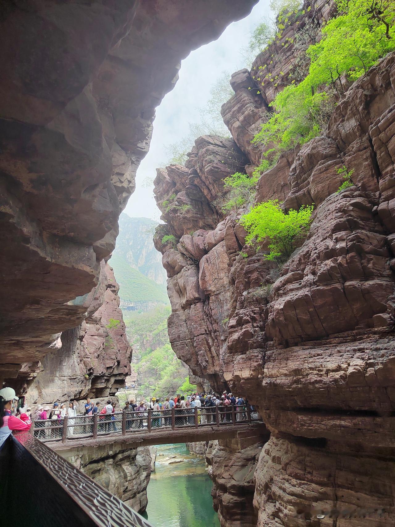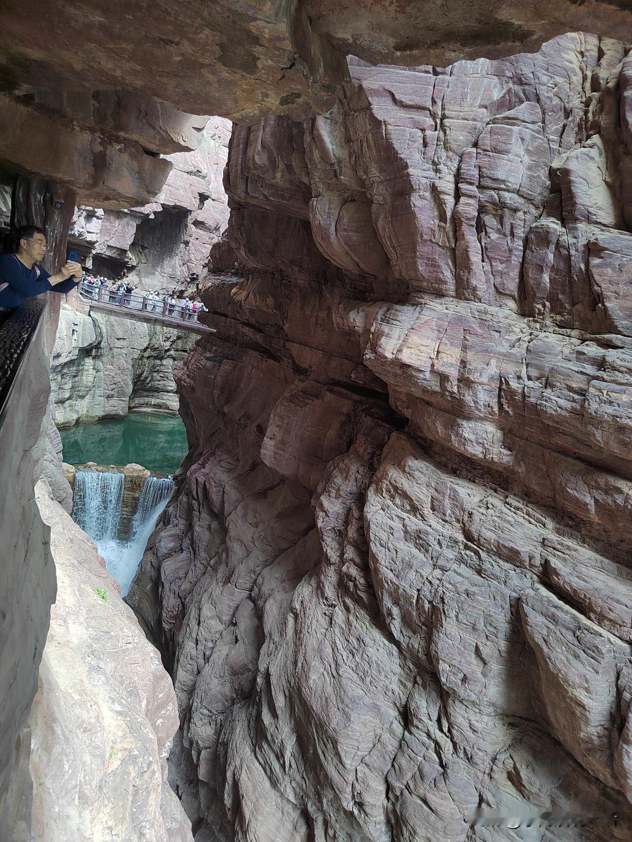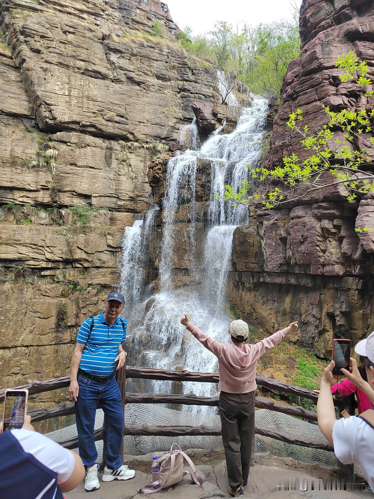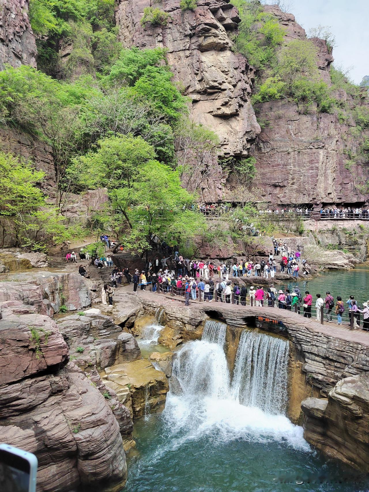 退休后第一次出游! 打卡云台山! 云台山位于太行深谷中。 红石峡堪称一幅活动的画卷。 壁立的崖壁红灿灿,温润如宝石! 青绿的小树从崖壁缝隙中伸出,虬曲而茁壮,表现出一种生命的顽强! 最绝的是那像碧玉一般流淌的峡谷清泉。 遇崖成瀑! 遇沟成潭! 遇洼成滩! 时而飞溅激荡,时而潺潺流淌,时而静默无波。 有小鱼在水中游荡。 水面上有几只黑色的天鹅在慢慢飘动。 来自全国各地的游客纷至沓来。 他们一会儿与崖壁合影。 一会儿用手撩起水珠,显出几分活泼。 一会儿又站在飞奔的瀑布下,摆出娇弱的造型。 人们走走停停,眼睛都不够用,嘴里还发出一声声惊叹和赞美! 我一会儿看看崖壁,一会儿看看水流,一会儿又看看人。 手里攥着手机,忍不住啪啪地拍照! 有几次,我想和景色合影! 可看了看自己那张老脸,又看了看绝美的风景,我不由得叹了口气。 还是只留下绝美的风景吧! 我真的不想因为我的参与,而让风景逊色! 你们看看,这儿美不美?