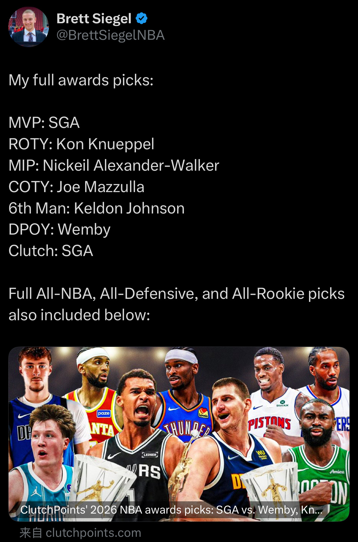 记者Brett Siegel(NBA赛季奖项投票人)公开了他提交的所有投票选择:
