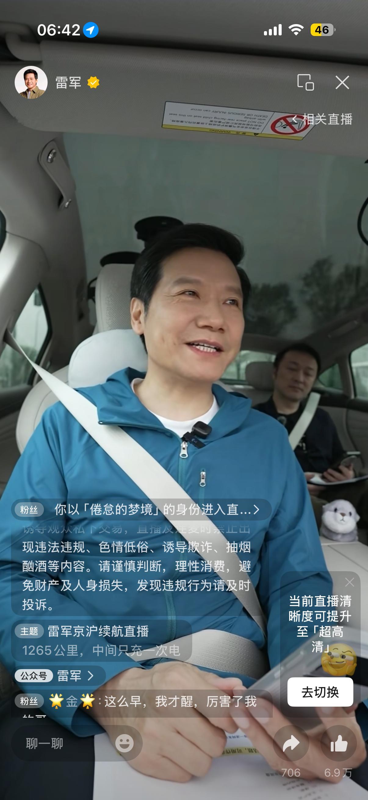 小米李肖爽透露,雷总明早直播不开车,由同事轮流开,安全是第一位的。