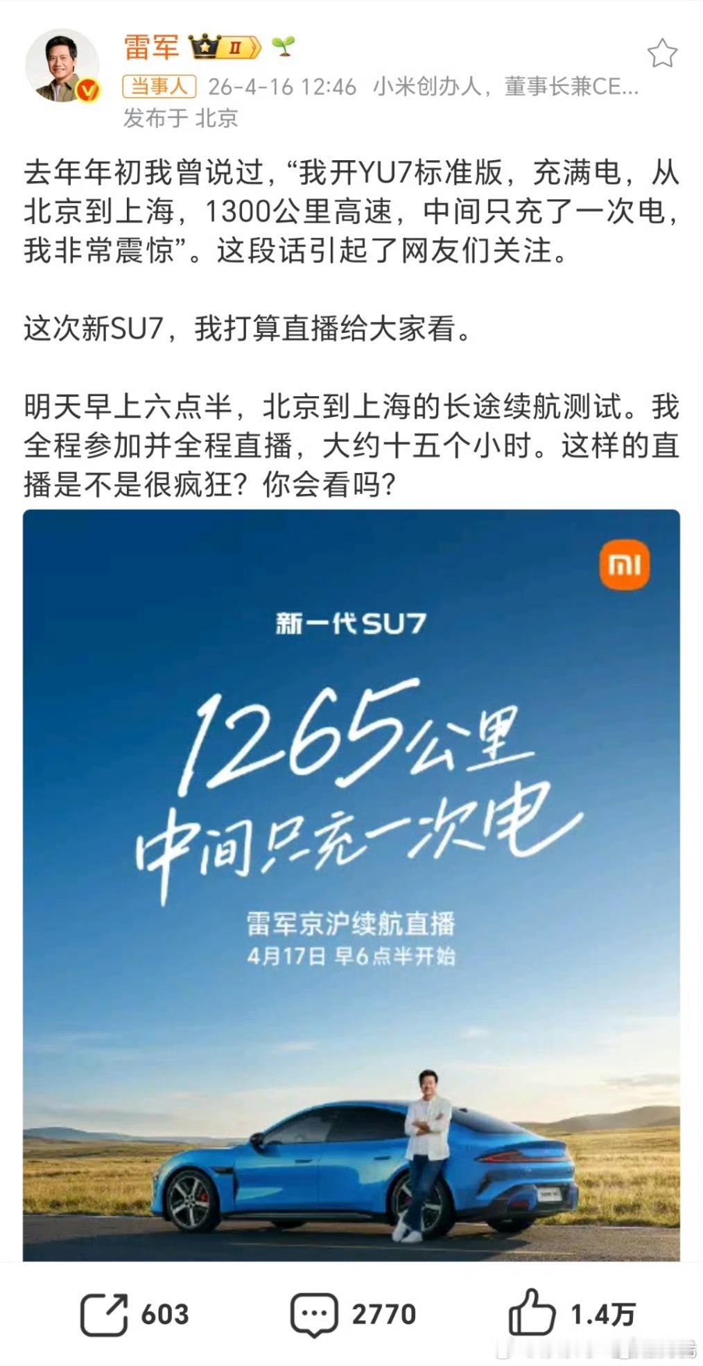 新一代SU7长途续航测试雷军 15 小时直播 SU7 续航测试!车圈劳模实锤了一早就被雷总刷屏!今早 6:30 准时开播,亲自开新一代 SU7 跑京沪线,全程 15 小时不中断、无脚本、不换人,挑战 1265 公里只充一次电。这波操作直接把 "车圈劳模" 焊在身上了!从手机圈卷到汽车圈,雷总这拼劲谁看了不说句服?15 小时直播无剪辑,全程实时播报,这自信也是没谁了。现在直播间还在播,有没有一起蹲续航结果的?来聊聊:你觉得新一代 SU7 最终续航能到多少?