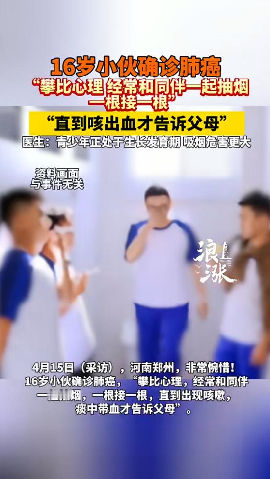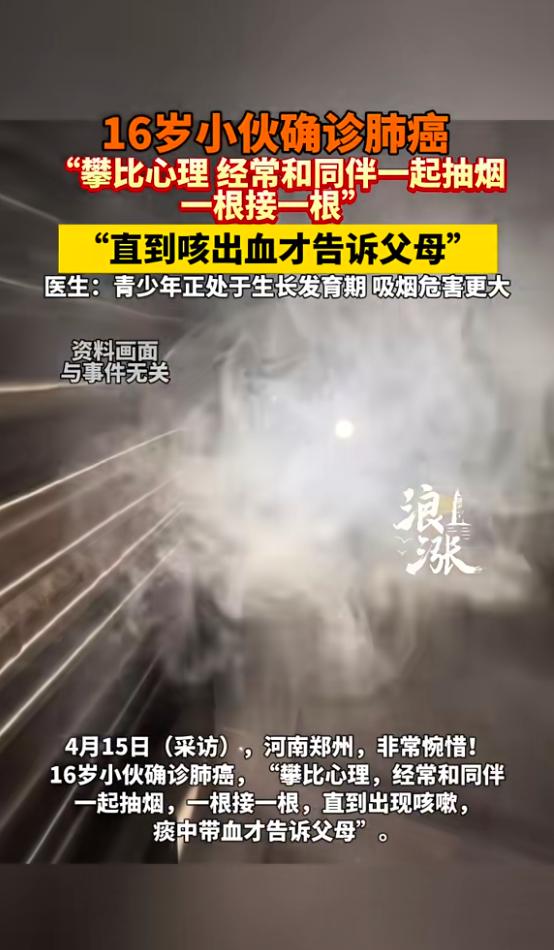 “悲剧还是发生了!”河南郑州,一16岁男生因为攀比心理,看见同伴抽烟,自己也跟着抽,并且一根接一根,出现咳嗽也不重视,直到咳出血才告诉父母,去医院检查后,发现男生竟确诊为肺癌,医生都表示十分惋惜!网友:太痛心了! 悲剧还是发生了,就在河南郑州,一个才16岁的男生,本该是坐在教室里读书、和同学打闹的年纪,却因为一时的攀比心理,把自己的健康彻底毁了,说出来真的让人心里发堵。 据了解,这个男生今年16岁,还是个中学生,平时和身边几个同伴走得比较近,前段时间,他看到同伴们都在抽烟,觉得特别有面子,也怕自己不合群被嘲笑,骨子里的攀比心上来了,就跟着学起了抽烟。 刚开始的时候,他还只是偶尔抽一根,慢慢的,烟瘾越来越大,一根接一根地抽,有时候一天下来能抽好几根。 大概抽了一段时间后,他开始频繁咳嗽,一开始以为只是小感冒,觉得扛一扛就过去了,根本没当回事,依旧每天抽烟,哪怕咳嗽越来越厉害,也没想着告诉父母,更没想去医院看看。 这个年纪的孩子,要么是不懂吸烟的危害,要么就是好面子,觉得这点小毛病没必要大惊小怪,怕被父母说,也怕同伴笑话自己娇气。 直到有一天,他咳嗽的时候,突然咳出血来,这一下他才慌了神,吓得赶紧告诉了父母,父母得知后,魂都快吓飞了,连夜带着他去医院做检查,一路上都在不停安慰孩子,心里却早已乱成一团。 检查结果出来的那一刻,一家人彻底崩溃了,这个16岁的男生,竟然被确诊为肺癌。 接诊的医生看到结果,也忍不住惋惜,说这么小的年纪就患上肺癌,大多和长期吸烟有关,青少年正处于生长发育阶段,肺部还没成熟,吸烟的危害比成年人大多了,要是早点发现、早点戒烟,也不会走到这一步。 这件事传到网上后,网友们都炸开了锅,没人不觉得痛心,有人说,都是攀比心害了孩子,年纪轻轻就学着抽烟,根本不知道烟草有多伤人。 也有人说,父母和学校还是要多关注孩子的身心健康,平时多普及吸烟的危害,别让这样的悲剧再发生,其实仔细想想,这个男生的悲剧,真的不是偶然。 现在不少青少年,都有这样的攀比心理,看到别人做什么,自己就跟着做,不管是好的还是坏的,只为了融入群体、撑面子。 加上他们对吸烟的危害认知不足,总觉得吸烟是“成熟”“酷”的表现,却不知道,每抽一根烟,都是在透支自己的健康。 青少年的肺部还在发育,烟草里的有害物质会直接损伤呼吸道黏膜,慢慢侵蚀肺部,长期吸烟不仅会引发咳嗽肺功能下降,还会大大增加患肺癌的风险,而且这个年纪的孩子,自控力不强,一旦染上烟瘾,很难戒掉。 这件事给所有家长和青少年都敲了个警钟,攀比不可取,跟风更要不得,对于孩子来说,别被所谓的“面子”绑架,远离吸烟的同伴,认清吸烟的危害,才是对自己负责。 对于家长,平时多和孩子沟通,关注他们的心理变化,及时普及健康知识,才能守护好孩子们的成长,愿这样的悲剧,再也不要发生在少年身上。