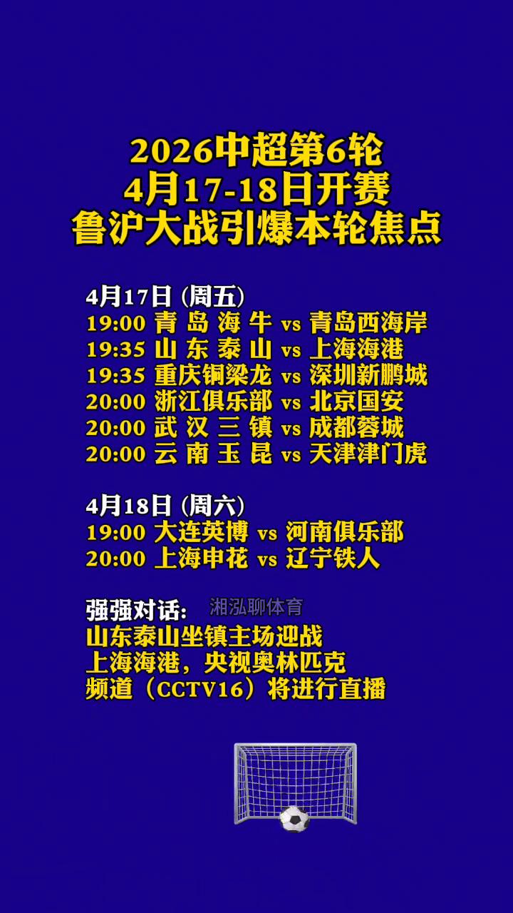 2026中超第6轮,4月17-18日开赛,鲁沪大战引爆本轮焦点。 湘泓聊体育。 4月17日(周五):19:00青岛海牛vs青岛西海岸;19:35山东泰山vs上海海港;19:35重庆铜梁龙vs深圳新鹏城;20:00浙江俱乐部vs北京国安;20:00武汉三镇vs成都蓉城;20:00云南玉昆vs天津津门虎。 4月18日(周六):19:00大连英博vs河南俱乐部;20:00上海申花vs辽宁铁人。 强强对话:山东泰山坐镇主场迎战上海海港,央视奥林匹克频道(CCTV16)将进行直播。