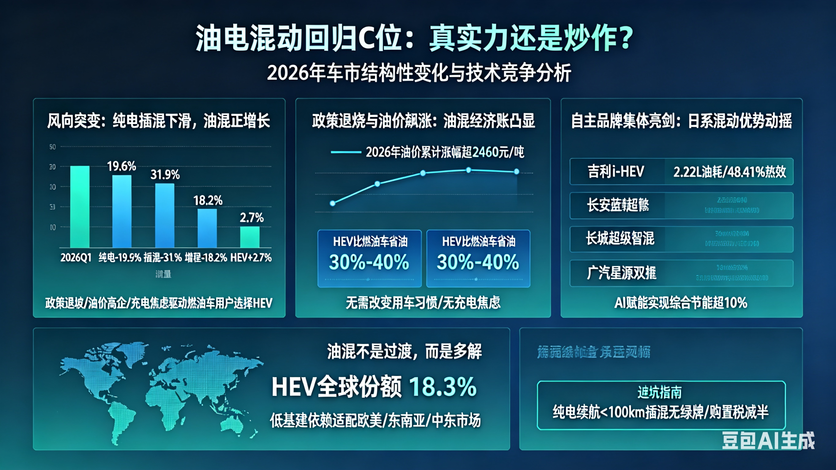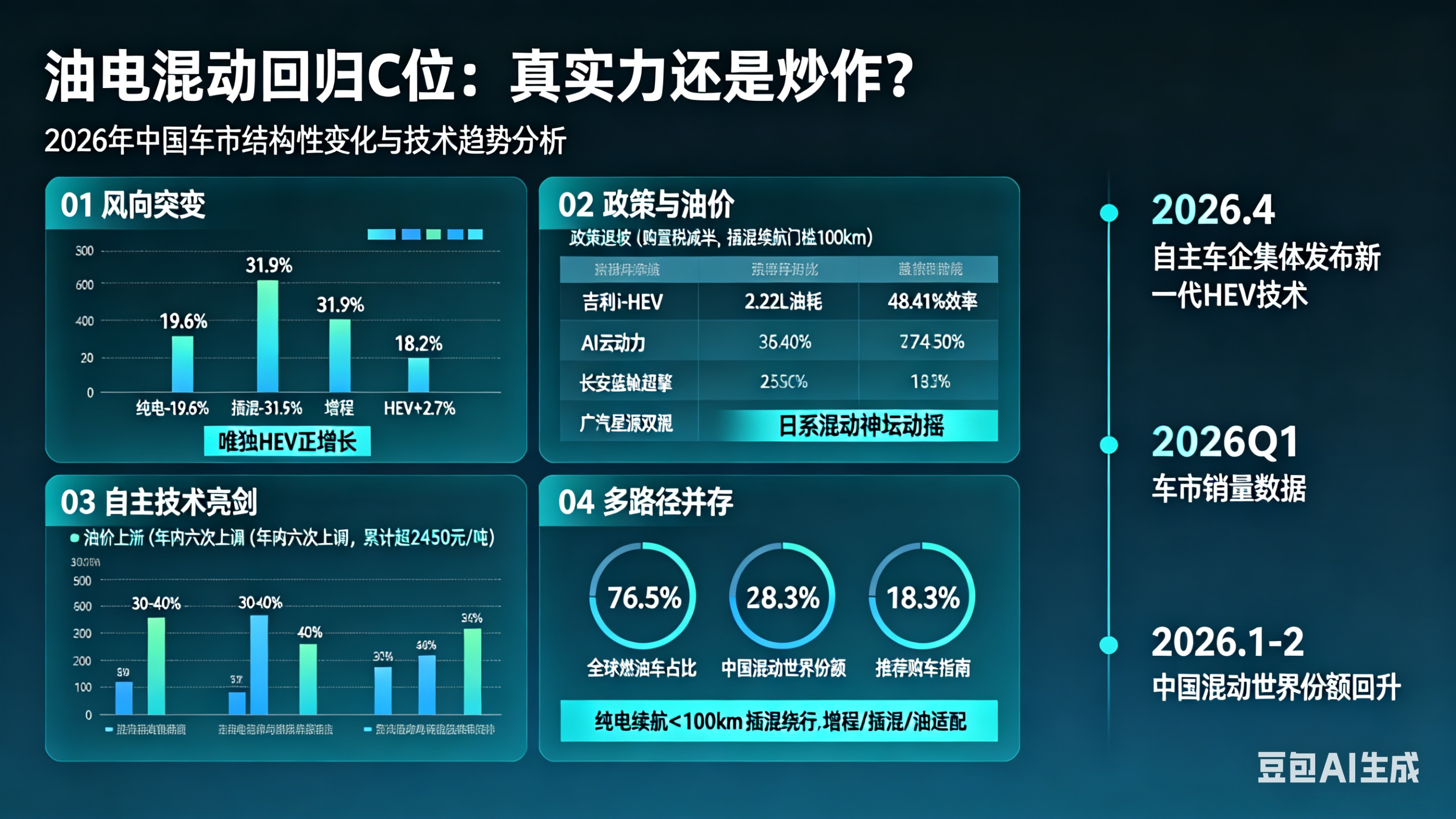 车市的风向,变得比四月天的脸色还快。就在几年前,纯电和插混还是舞台上最耀眼的明星,油电混动(HEV)则被不少人视为即将淘汰的“过渡方案”。然而2026年4月刚过,一场静悄悄的技术围猎正在撕毁这张旧剧本,中国几大主流车企几乎在同一时间不约而同地亮出了新一代油电混动的“秘密武器”。