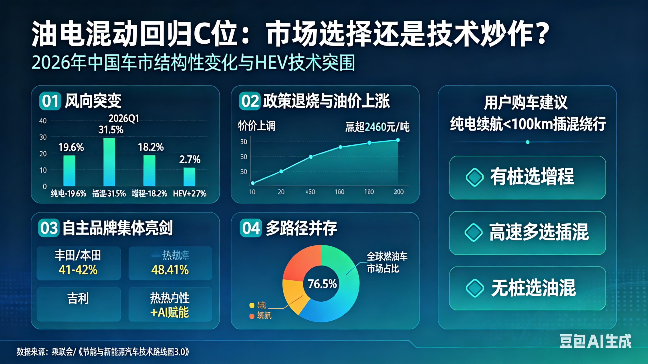 对于消费者来说,选择变多了,但坑也更多了。2026年的核心避坑指南只有一条:纯电续航低于100公里的插混车型,不再享受绿牌和购置税减半的核心福利,市面上那些续航50、80公里的老款混动,除非价格极其诱人,否则建议绕行。有固定充电桩、追求纯电体验的,优先看增程;经常跑高速、充电不便的,优先考虑插混;完全没有充电条件、只想省心省油的,油混就是最优解。