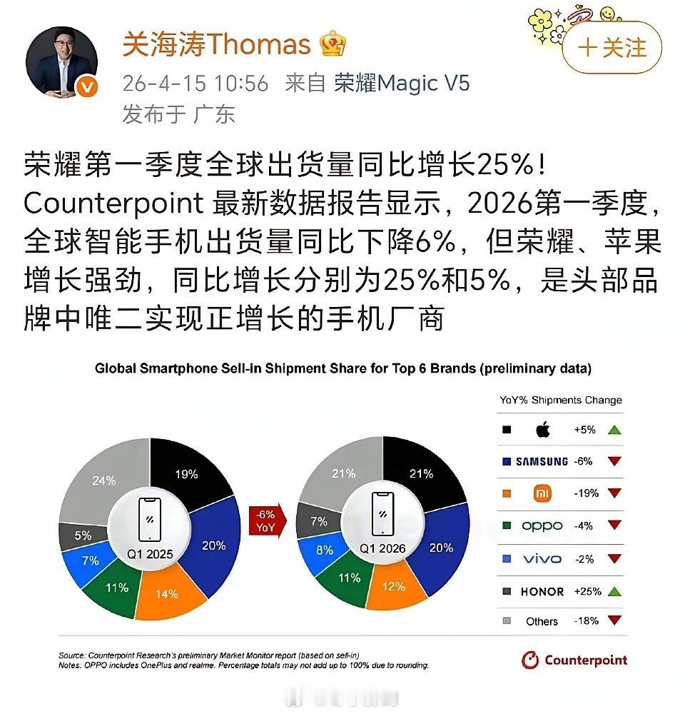 肖战真是行走的财神爷啊!一季度全球手机销售额普遍下降,大盘更是直接降6%,只有苹果和荣耀是涨的,而且荣耀大涨,涨了25%呢。就这个影响力,难怪华为汽车一下子就要吻上来了。