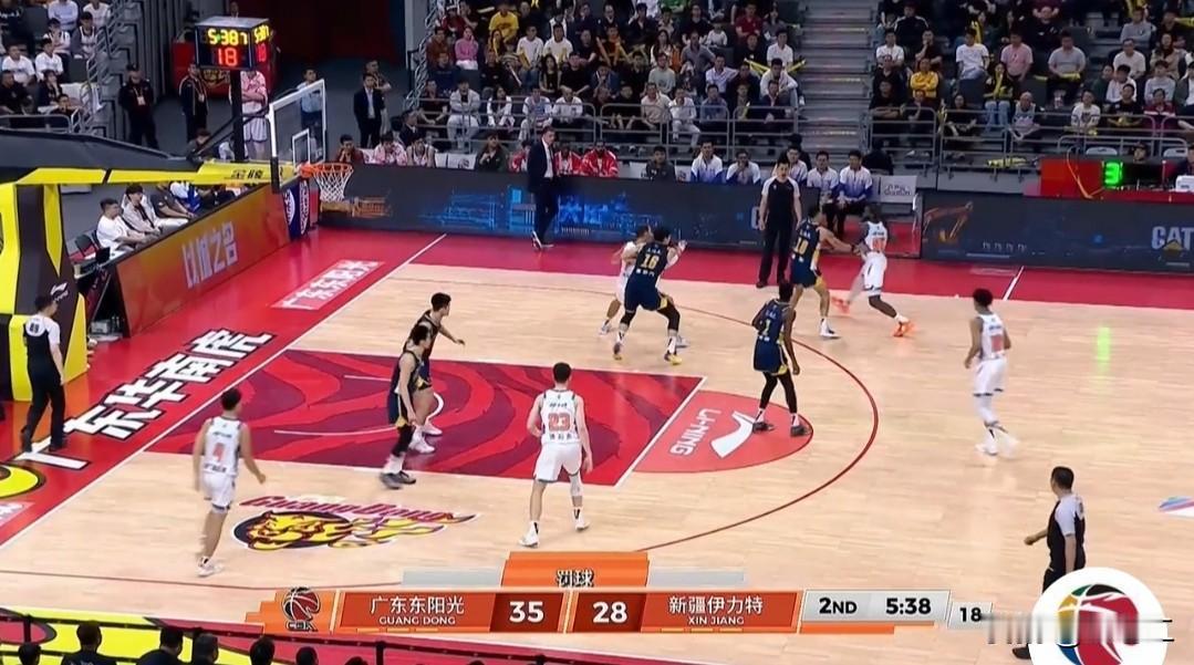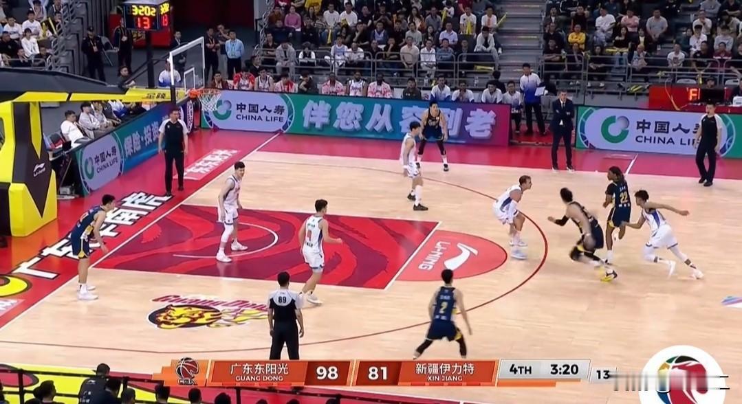 这是CBA广东队在主场对阵新疆队的比赛。开场后,新疆队迅速发起攻势,打出15 - 6的比分,占据上风。 随后,广东队稳住节奏,在第二节实现反超,并带着领先优势进入下半场。 末节,广东队进一步扩大分差,在攻防两端都展现出更强的侵略性。新疆队始终未能找到追分的办法,最终广东队赢得了比赛。 从首节落后到末节掌控比赛,广东队凭借强硬的防守和稳定的进攻,逐步扭转战局,拿下这场关键对决。
