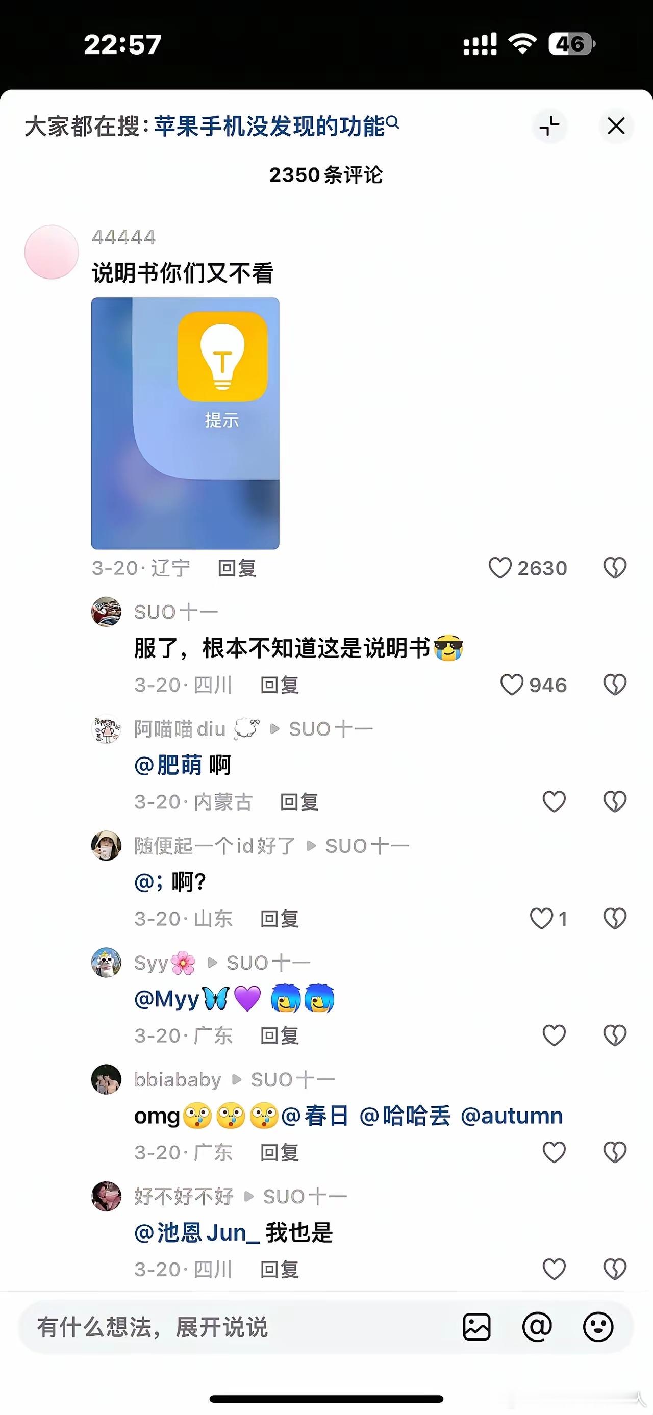 大半夜的,被自己的蠢操作整破防了!用了这么多年苹果,才发现人家是有说明书的啊!就是那个叫“提示”的自带APP,妥妥的电子说明书📖结果我当年刚拿到手机,一顿操作猛如虎,第一件事就是把这说明书给卸了!今晚赶紧连夜给它请回来了~😇🥲