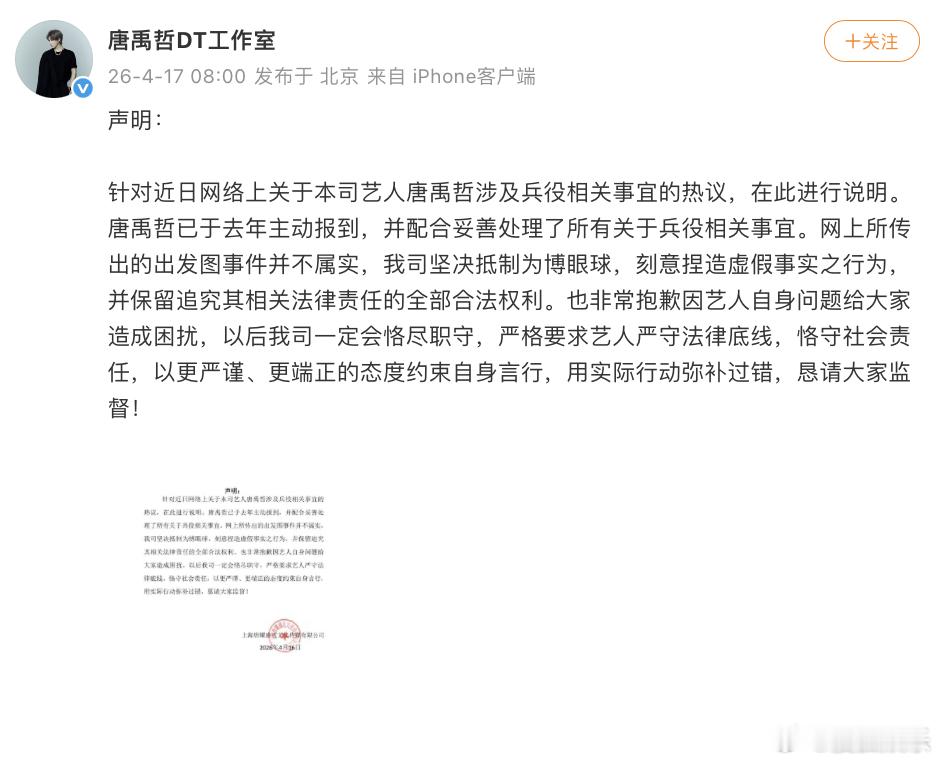唐禹哲工作室声明今日,工作室发布声明回应“唐禹哲自首出发图”相关,表示唐禹哲已于去年主动报到,并配合妥善处理了所有关于兵役相关事宜,网上所传出的出发图事件并不属实。