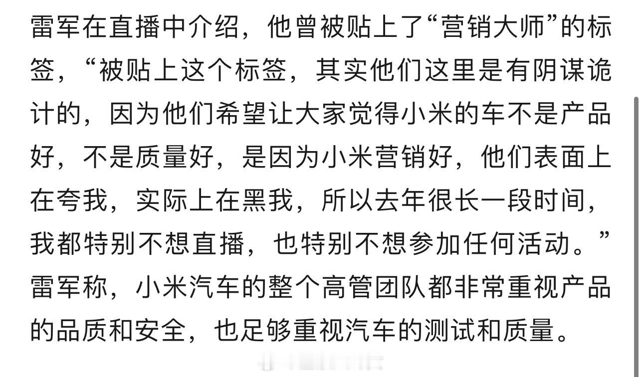 雷军回应被贴上“营销大师”标签:表面在夸我,实际在黑我,去年很长一段时间不愿直播,也特别不想参加任何活动雷军回应是否做10万以内车型