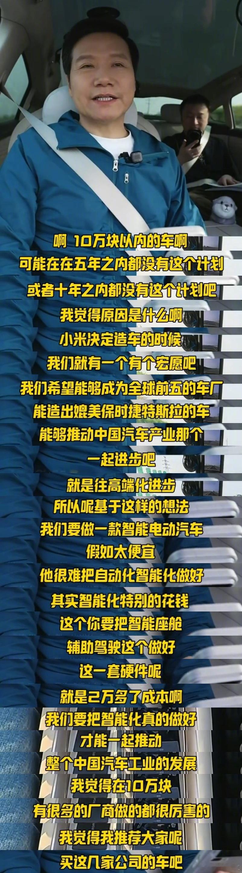 雷军:小米造10万块以内的车,可能在五年之内,或者十年之内都没有这个计划。