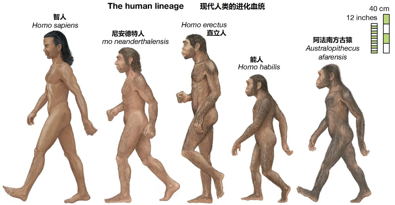 同猛犸象不是亚洲象、非洲象的祖先,剑齿虎也不是东北虎、孟加拉虎的祖先一样,直立人也不是现代人类的直接祖先,“它们”是我们的“远古近亲旁支”。 我国境内发现的元谋人、蓝田人、北京人、郧县人、和县人、南京汤山人、辽宁庙后山人、山东沂源人、陕西洛南人等,都是不同时期的直立人演化序列,祖先也来自非洲,后来都灭绝了,没有演化成我们现代人类。 直立人属于猿到人演化的中间阶段(猿→猿人→人),既不是猿,也不是现代意义上的人,而是“猿人”。其实应该称直立人为北京“猿人”、元谋“猿人”更恰当,人称上用“它们”而非“他们”更贴切。直立人大约生活在200万~20万年前。 打个比方,把一只直立人(原谅我用“只”字)放到大马路上,是非常容易辨认出来的,“它们”长得跟我们现代人差距很大。 我们的祖先是大约6万~10万年前从非洲迁徙过来的智人,取代了当地古人类。 我国境内发现的早期智人包括大荔人、许家窑人、丁村人、马坝人、长阳人、桐梓人等,晚期智人包括著名的山顶洞人、柳江人、资阳人、河套人、左镇人、峙峪人等,国际上著名的尼安德特人、海德堡人、克罗马农人、长者智人等等也是智人。 打个比方,如果把一位山顶洞人穿上衣服扔到大马路上,估计再也找不回来了,特别是晚期智人,跟现代人之间的差距很小。 总结来说,直立人将人类与猿类真正分开,智人成为今天的我们。 所以说我们的直接祖先是智人,而不是直立人;是山顶洞人,而不是北京猿人。
