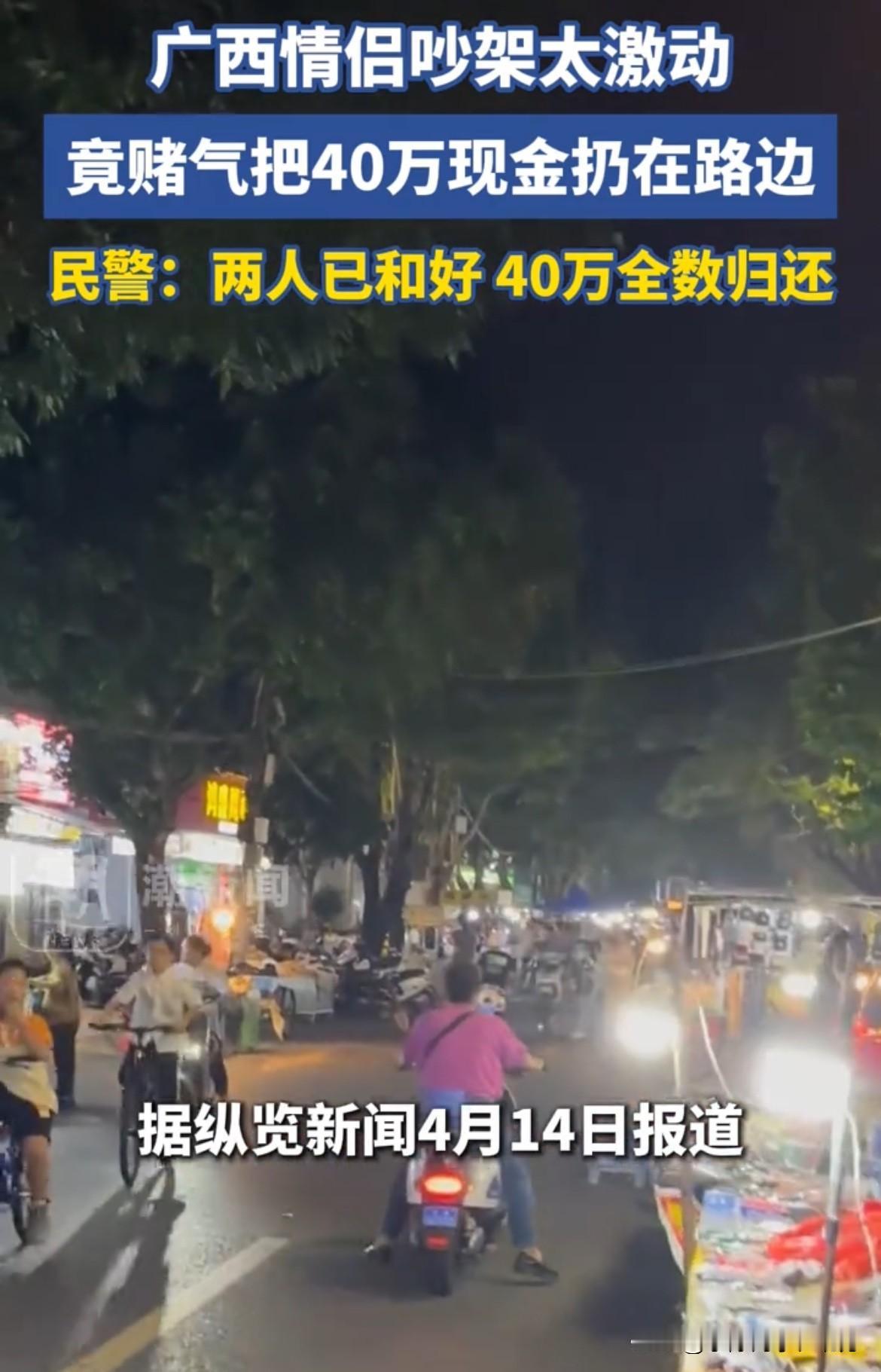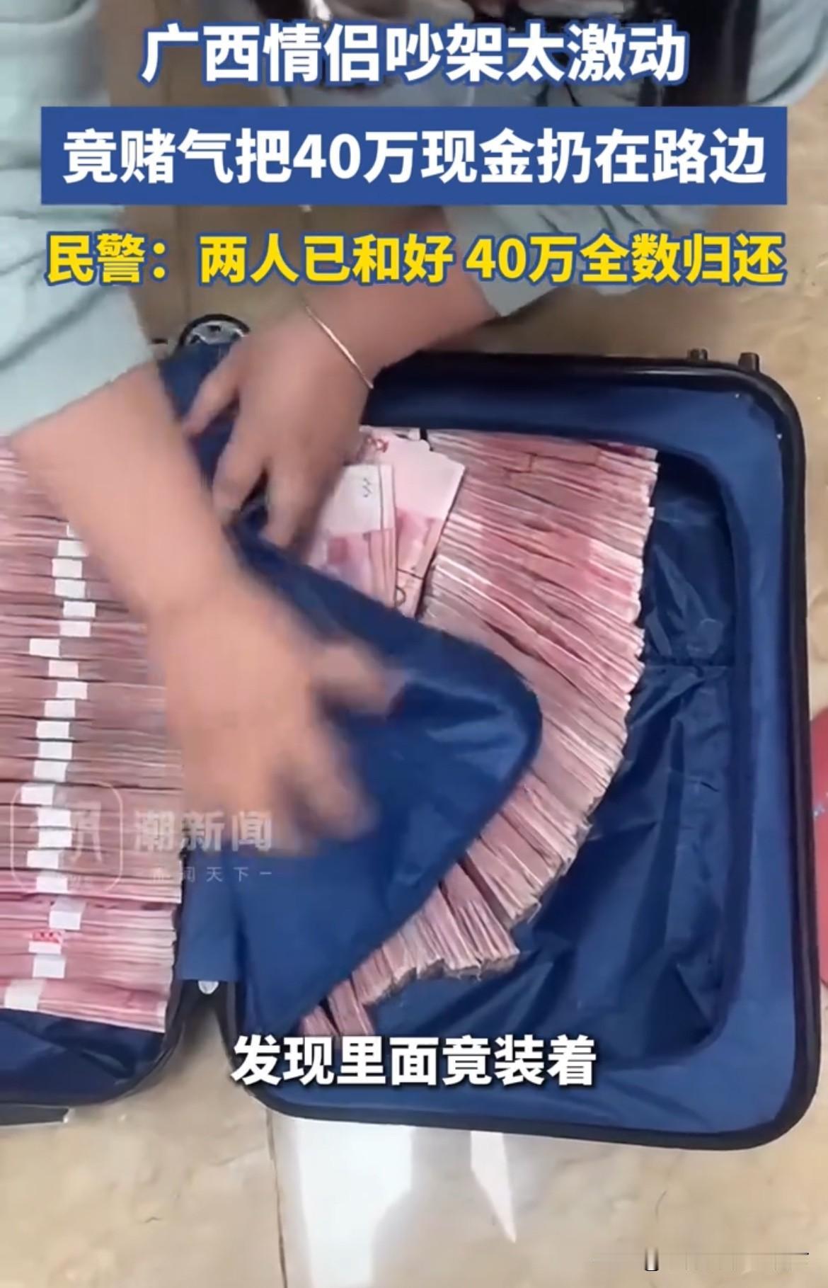 把40万现金扔在路边!近日,在广西北海就发生了这样离谱又惊险的一幕,一对情侣因为感情纠纷吵得不可开交,情绪上头彻底失去理智,竟然将装着40万现金的行李箱随手遗弃在路边夜市,幸好被巡逻人员及时发现,才避免了这笔巨款丢失,不然这对情侣怕是要追悔莫及。 事情发生在广西北海海城的富贵路夜市街,这里一到晚上就人流量巨大,热闹非凡,摆摊的、逛街的、吃饭的人来人往,是当地十分繁华的路段。 事发当晚,海城公安西街派出所的义警侯金豪像往常一样,在夜市周边开展夜间巡逻工作,维护现场秩序保障群众的财产和人身安全。 当巡逻至夜市一处路边时,一个孤零零放在地上的黑色行李箱引起了侯金豪的注意,这个行李箱看起来完好无损,不像是被丢弃的废旧物品,可当时周边来来往往很多人,却没有一个人上前看管,长时间放在路边十分显眼。 出于职业敏感,侯金豪第一时间上前查看,先是在周边询问了一圈,询问过往市民和摆摊商户是否认识这个行李箱,有没有人遗失物品,可大家都纷纷摇头表示没见过。 担心行李箱内有重要物品或者贵重财物,侯金豪没有擅自打开,而是第一时间联系了派出所值班民警,等待民警到场后,在众人的见证下,小心翼翼地打开了这个神秘的黑色行李箱。 当箱子被打开的那一刻,在场所有人都惊呆了,箱子里没有衣物、没有杂物,整整齐齐码放着的全是一沓沓的现金,红彤彤的钞票堆在一起看着格外惊人。 民警当场对现金进行清点,经过仔细核对,行李箱内的现金足足有40万元,40万现金就这样被随意扔在人来人往的夜市路边,一旦被别有用心的人拿走,想要找回无疑是难上加难。 意识到事情的严重性,值班民警李和兴立刻展开调查,通过调取周边监控、走访现场群众等方式,全力寻找这笔巨款的主人。 经过一番细致的排查和追踪,民警很快锁定了行李箱的主人,正是一对年轻情侣。 随后,民警第一时间联系上了这对情侣,接到民警电话时,两人还处于吵架后的情绪激动状态,一开始甚至都没反应过来自己把巨款扔了,等听清民警说的内容后,当场吓得脸色发白,瞬间清醒过来,赶紧赶往派出所。 见到民警和失而复得的40万现金,这对情侣又愧疚又后怕,连忙向民警讲述了事情的经过。 原来,两人当天因为一些感情琐事发生争执,一开始只是小吵小闹,可双方都不肯让步,越吵越凶,情绪越来越激动,完全被怒火冲昏了头脑,说话做事都不管不顾。 争吵过程中,两人都在气头上,为了赌气,竟然做出了极端的举动,直接将装有40万现金的行李箱扔在了路边,随后便自顾自地离开了,全程都没有意识到自己的行为有多离谱,更没想过40万现金丢在路边会有什么后果。 直到民警联系他们,两人才从愤怒的情绪中冷静下来,想起自己随手丢弃的巨额现金,顿时慌了神,心里满是后悔,直言要是这笔钱真的丢了,自己都没法原谅自己。 了解清楚事情的来龙去脉后,民警既觉得好笑又十分无奈,当即对两人进行了严肃的批评教育。 确认现金完好无损、一分不少后,民警将40万现金悉数归还给了这对情侣,拿到失而复得的巨款,两人连连向民警和义警表示感谢,不停地说道:“真是太谢谢你们了,要是钱丢了我们真的不知道该怎么办,以后再也不会这么冲动了!” 这件事在网上曝光后,立刻引发了网友们的热议,大家纷纷表示震惊又无语。 有网友调侃:“有钱人吵架都这么任性吗?40万说扔就扔,我连吵架都不敢这么嚣张”。 也有网友无奈表示:“情绪上头真的太可怕了,再生气也不能跟钱过不去啊,这要是丢了,哭都没地方哭”。 还有网友提醒:“情侣吵架一定要冷静,冲动是魔鬼,不光是丢钱,还可能做出更危险的事,沟通才是解决问题的办法”。 其实生活中,无论是情侣、家人还是朋友之间,矛盾和争执都在所难免,每个人都会有情绪激动、忍不住发火的时候,但越是生气,越要守住理智的底线。 千万不要因为一时的怒火,做出让自己后悔终身的决定,像这对情侣这样,随手丢弃40万现金,看似是发泄情绪实则是对自己的极度不负责,万一这笔钱真的丢失,不仅财产受损,两人的感情也可能彻底破裂得不偿失。 幸好这次遇到了认真负责的义警和民警,及时发现并妥善保管了巨款,还耐心调解了两人的矛盾,最终钱财没损失,感情也和好如初,算是圆满的结局。 可并不是所有人都能这么幸运,一旦因为冲动酿成大祸,再后悔也来不及了。 在此也提醒大家,遇到矛盾别冲动,有话好好说,学会控制自己的情绪,理性处理问题,别让一时的意气用事,毁掉自己的生活和财产。 毕竟情绪可以发泄,但不能失控,再生气也别拿钱财开玩笑,更别拿感情当赌注,冷静沟通、互相理解,才是相处长久的秘诀。