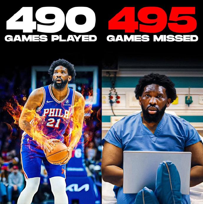 恩比德职业生涯至今,缺席的比赛比出战的还多。 ❌ 缺席495场 ✅ 出战490场 过去这些年,恩比德遭遇的伤病包括:贝尔氏麻痹症、膝盖扭伤、脑震荡、右眼眶骨折、右手拇指韧带撕裂、半月板撕裂、阑尾炎。 恩比德确实是不世出的天才,他没有从小接触篮球训练,进入NBA后很多技术动作也是看录像自己琢磨,居然让他拿到了MVP的奖杯。 但大概也是系统训练不足的原因,恩比德自己找到了比较投机取巧的方式——就是造犯规! 恩比德太喜欢倒地了,NBA球员很多时候倒地是为了对抗后的缓冲保护,而恩比德,有太多几乎没对抗的倒地,有时候就是刻意的演给裁判看。 加上恩比德练投篮大于练腿,他的下肢不稳,这么倒来倒去,最后把自己的双腿“献祭”了,现在运动能力和以前完全不能比,且耐伤的属性也荡然无存。 巅峰期曾经和约基奇平分天下,现在大帝只能看人家车尾灯了。