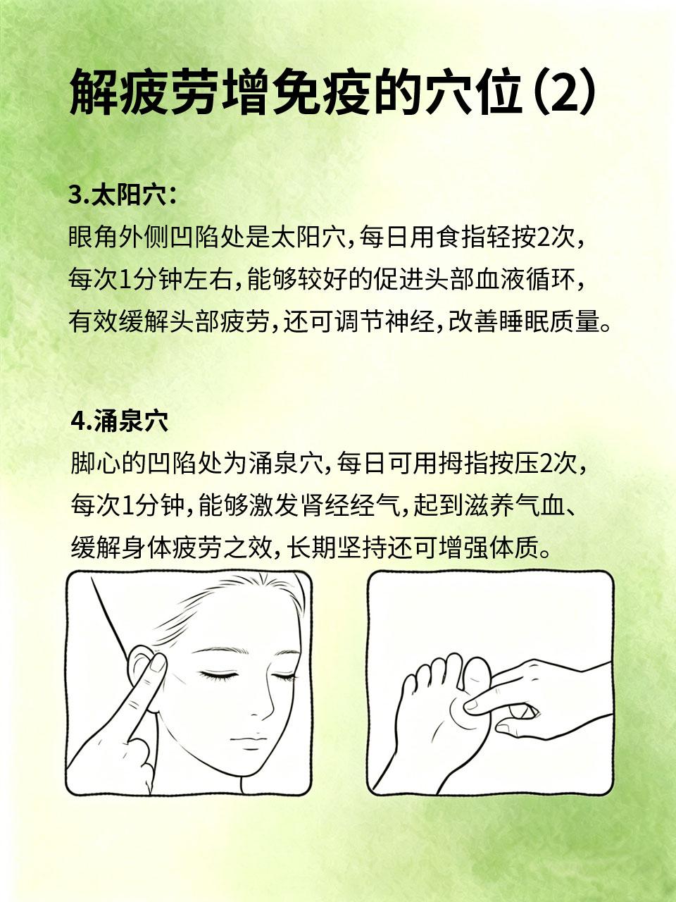 中医小常识:每天按4个穴位,缓解疲劳,增强免疫力 日常工作生活压力大💼,很多人都会感到疲惫不堪😩,免疫力也越来越差,容易生病🤧。分享4个中医常用穴位,每天按5分钟,不用花钱,就能缓解疲劳、增强免疫力,守护身体健康! 1.足三里🦵 2.合谷穴✊ 3.太阳穴🧠 4.涌泉穴🦶 这4个穴位简单易找,每天花5分钟按压,不用专业手法,就能有效缓解疲劳、增强免疫力,适合日常养生,每天坚持,身体会越来越棒~