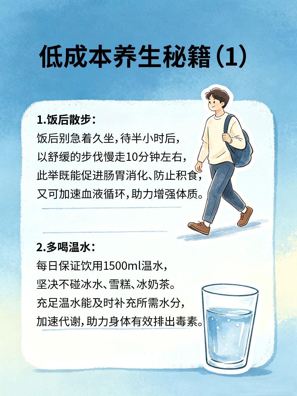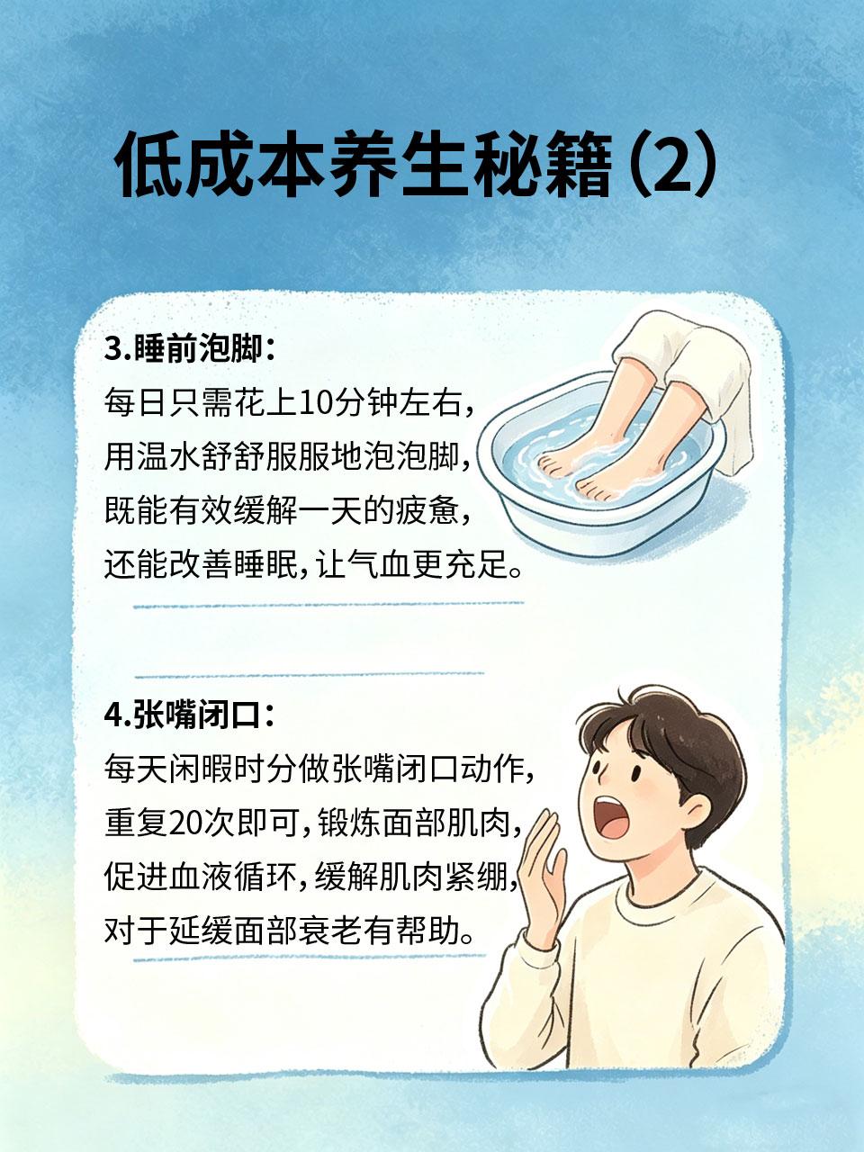 养生不费钱!利用碎片时间,做这4件事,越养越年轻 很多人觉得养生需要花很多钱买保健品、办健身卡💰,其实不然。日常碎片时间利用起来⏱,做这4件小事,不花钱、不费力,长期坚持,就能越养越年轻,气色越来越好! 1.饭后散步🚶 2.多喝温水💧 3.睡前泡脚🛀 4.张嘴闭口👄 养生从来都不是奢侈品,而是融入日常的小习惯。利用碎片时间,做好这4件事,不费钱、不费力,长期坚持,就能收获健康和好气色,越养越年轻~