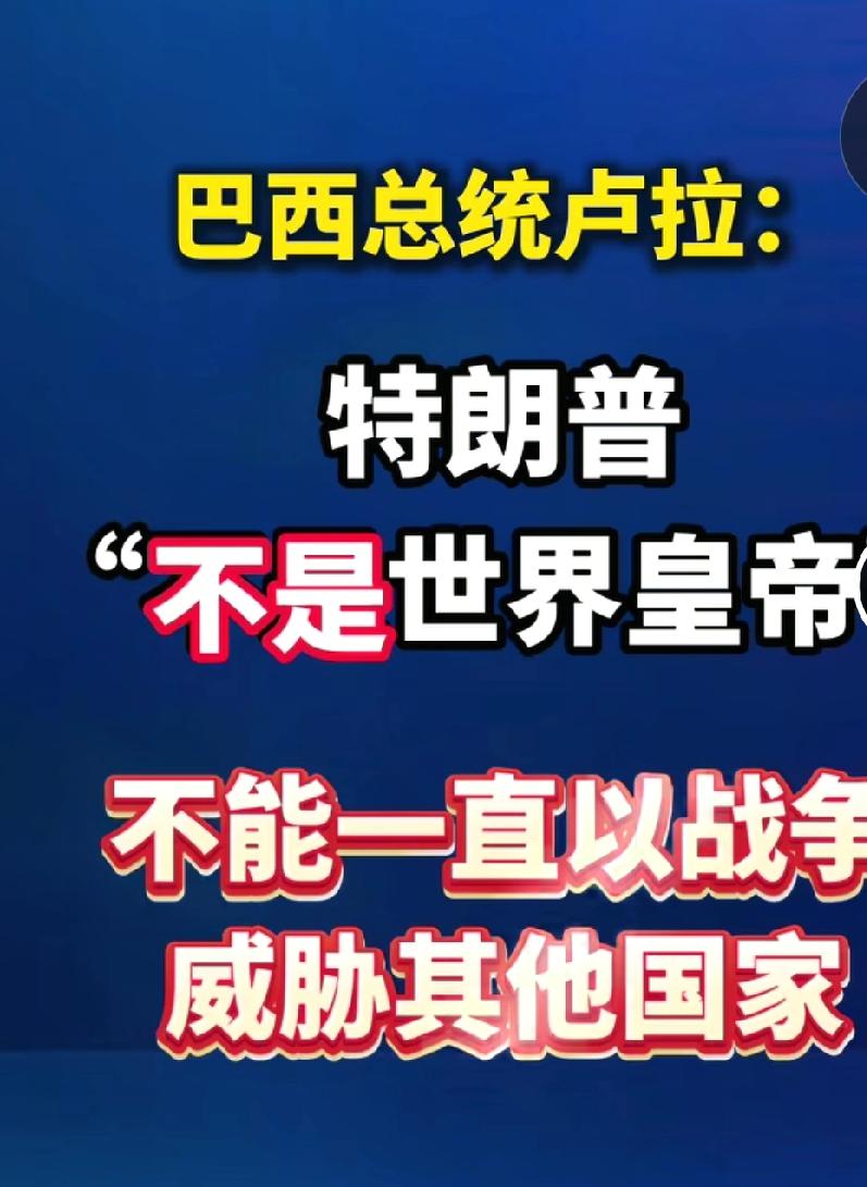 巴西总统卢拉,特朗普不是世界皇帝,世界上有200多个国家和地区,由联合国很多组织。什么事情不可能有美国特朗普一个人说了算,各国都有各国的领导,特朗普只能管美国人,不能越俎代庖,长臂管辖。不能一直以战争威胁其他国家,一开始大兵压境委内瑞拉,最后抓捕马杜罗。后来又大兵压境伊朗,联合以色列打击伊朗,现在威胁还要动古巴。 地球上的国家的事情,应该由主权国家自己去做出决定,选择什么道路,他们自己说了算。他们都是主权国家,有独立自主权。世界各国不分大小,不分强弱,都一律平等,不能再把这个世界带回丛林时代。不能带回19世纪。人类是文明社会,应该不断进步,不能倒退。