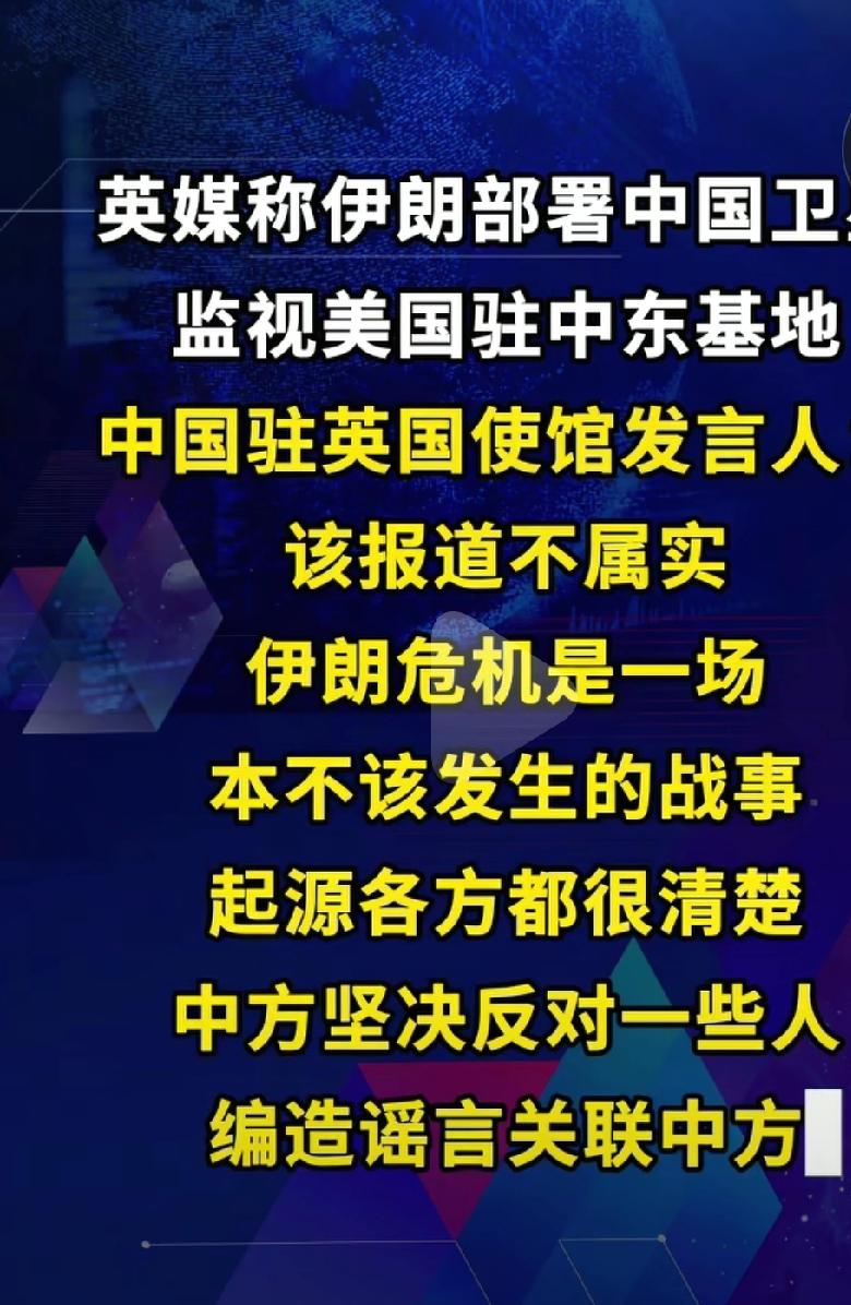 英国媒体称伊朗部署中国卫星监视美军在中东基地。这纯属子虚乌有,莫须有罪名。该报道不真实,中国从来不拱火挑衅。立足劝和促谈,维护地区和平,是世界上一支重要的和平力量。伊朗危机是一场本不该发生的战争,却因为以色列和美国为了一己之私利,对伊朗大打出手。如今还想嫁祸于中国,岂有此理。 我们坚决反对一些国家关联我们,不要动不动就联系我们。俄乌战争就有报道说,中国向俄罗斯提供武器援助。如果真的是那个样,战争也不会打到那么久。今天又开始关联我们,用心险恶。
