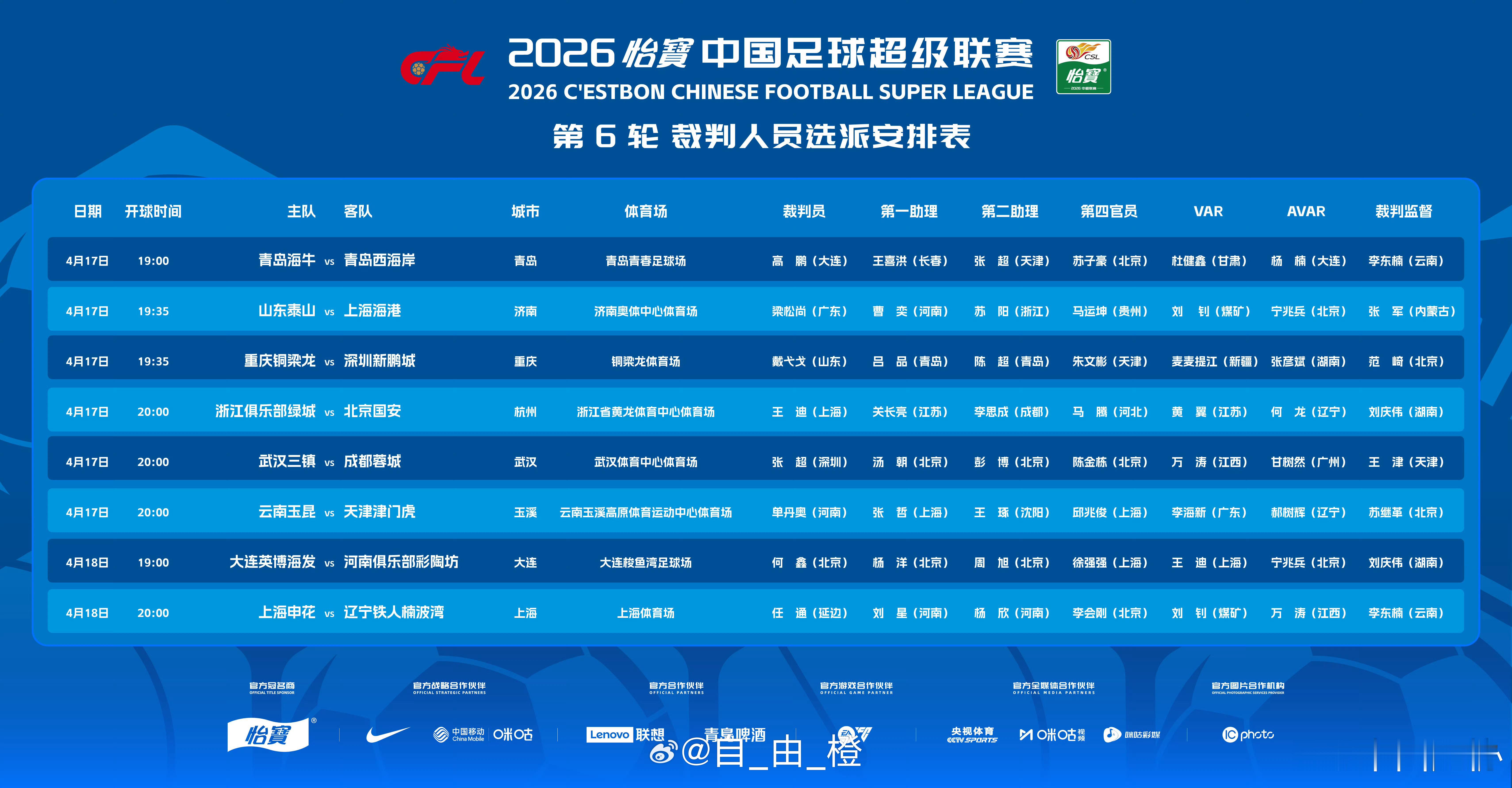中超联赛第6轮,山东泰山VS上海海港裁判组选派结果出炉。主裁判:梁松尚(广东) VAR:刘 钊(煤矿)