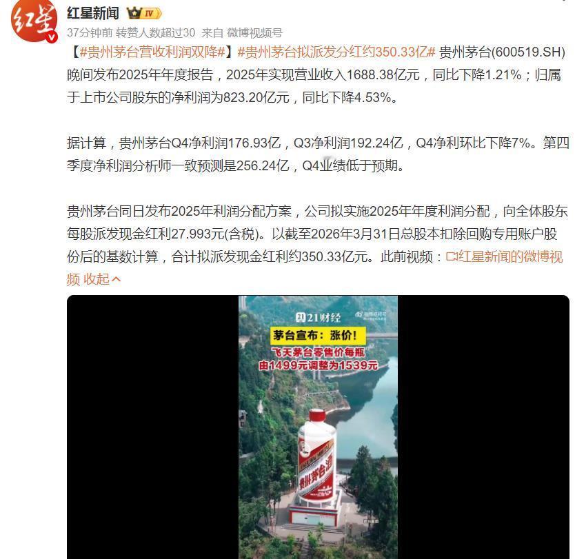 罕见!茅台上市以来首次营收、利润双降! 茅台最新交出了一份冰火两重天的业绩答卷! 冰的是,报告显示,公司上市 20 多年来首次出现年度营收与净利润双双下滑,引发“茅台也卖不动了?”的质疑。火的是,公司分红力度创历史新高,全年累计分红超 650 亿元 。 难怪段永平会如此热爱茅台了,因为这种大公司,甭管业绩如何波动,对股东的回报都是遥遥领先的