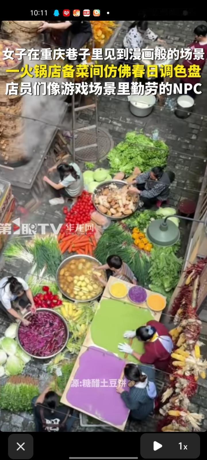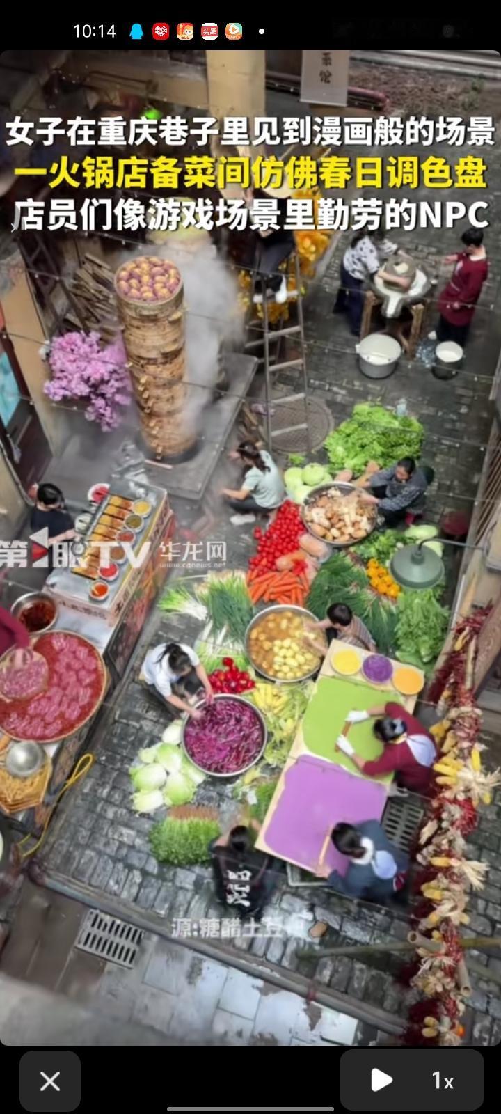 4月16日,重庆。女子发视频称,自己在箱子里看见儿童插画般场景,火锅店备菜间仿佛春日调色盘,店员们有的在洗菜,有的在蒸面点,他们就像游戏场景里勤劳的NPC