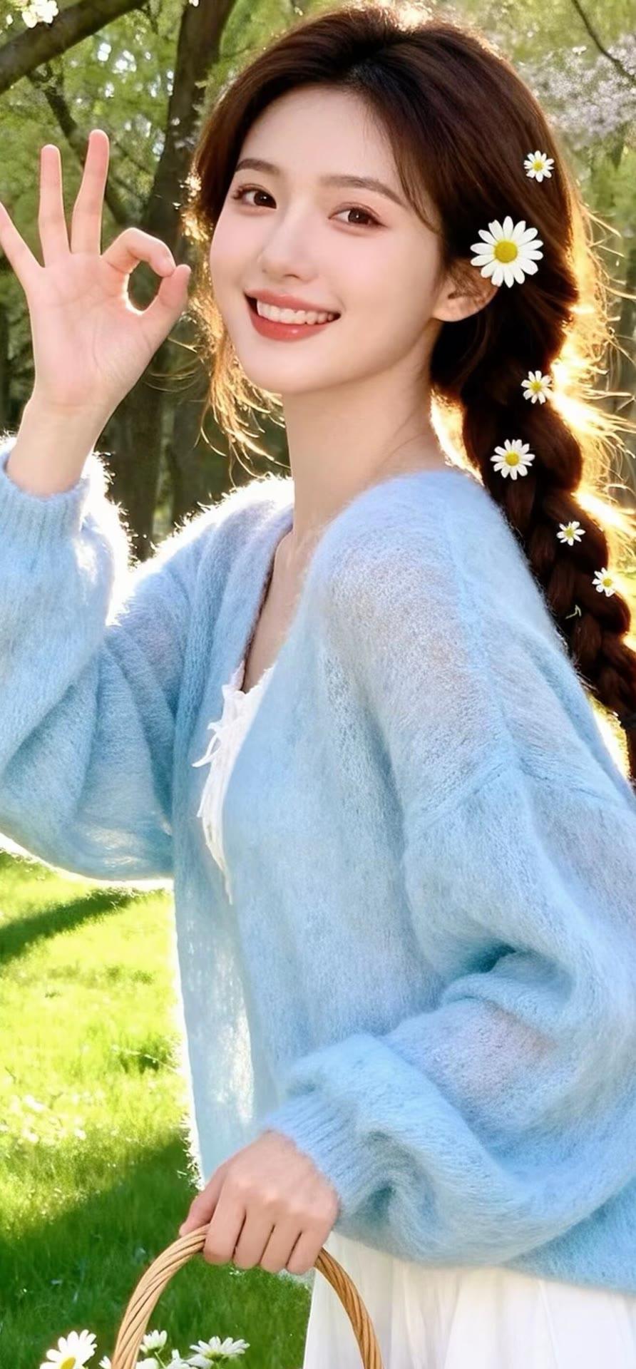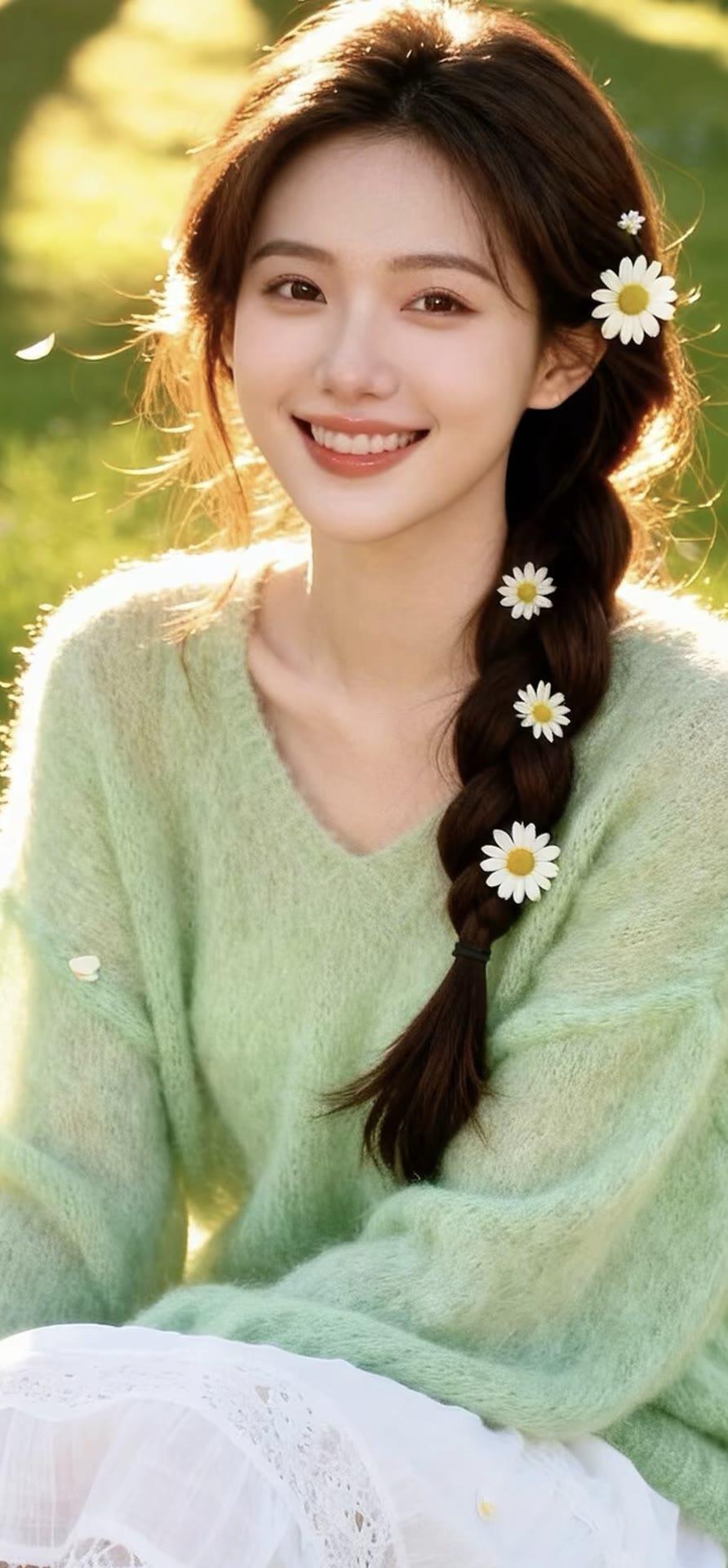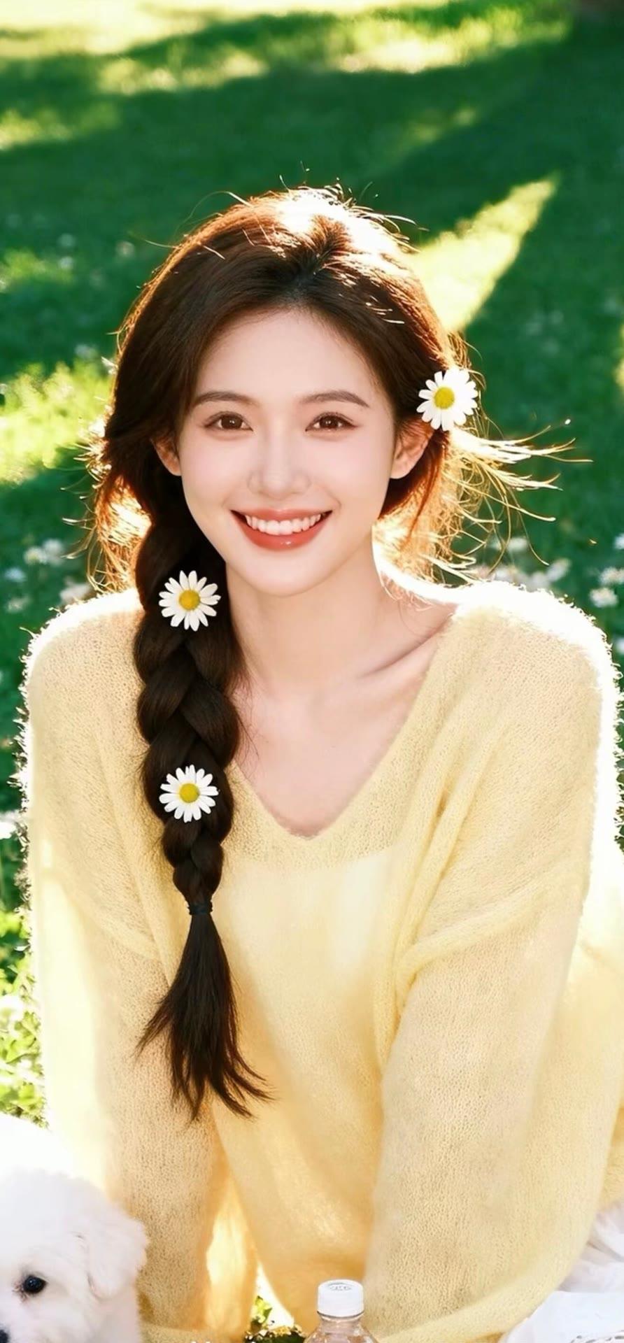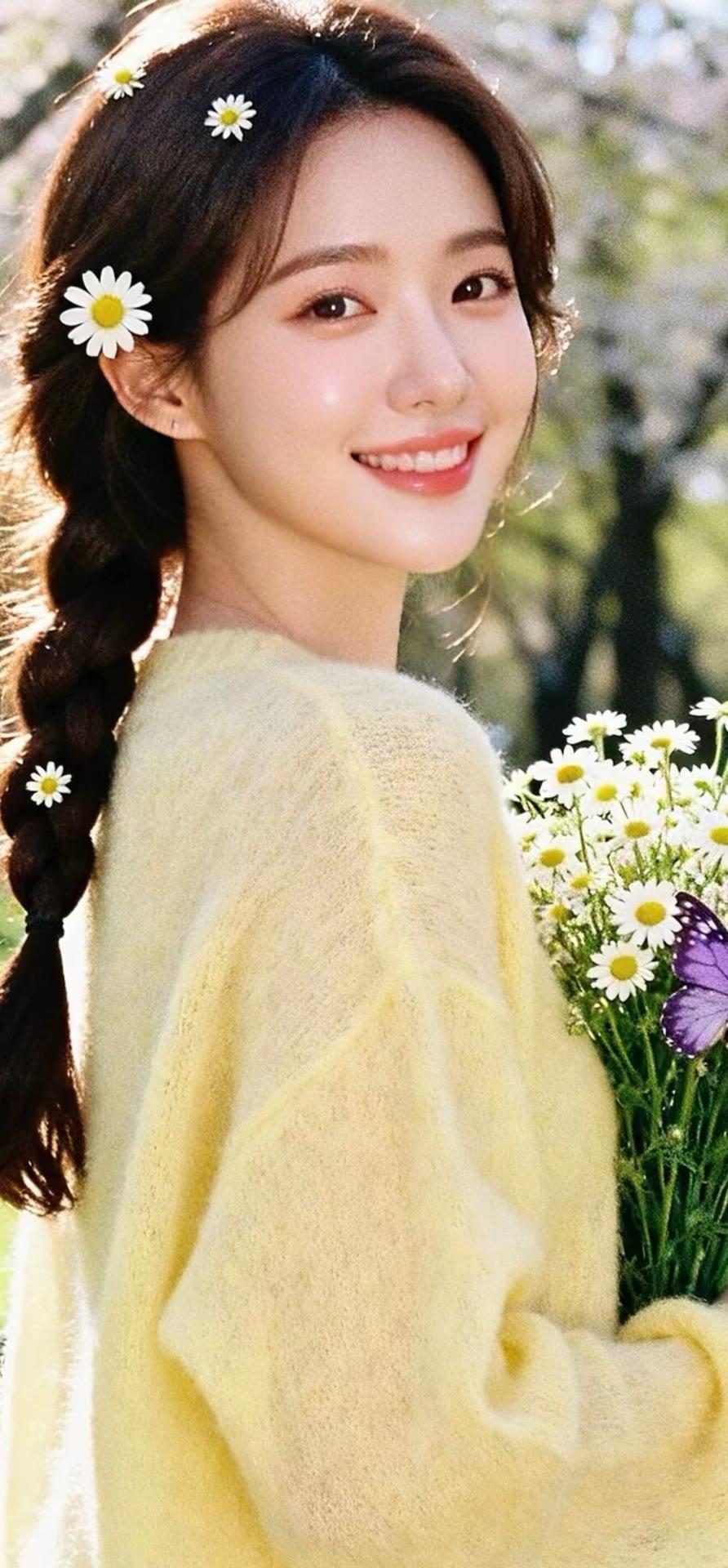 温柔甜美的花束女孩,黄色毛衣搭配珍珠饰品,清新自然。