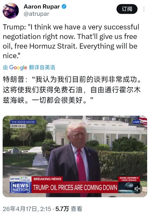 特朗普今天(北京时间4月17日)接受采访时表示:“我认为我们目前的谈判非常成功。这将使我们获得免费石油,自由通行霍尔木兹海峡。一切都会很美好。” 当地时间4月16日,特朗普已在白宫南草坪透露本周末可能重启面对面谈判,并称双方“已非常接近达成协议”。他强调希望在4月22日临时停火协议到期前敲定永久和平协议,甚至愿意亲赴巴基斯坦伊斯兰堡签署文件,以此认可巴方的调停作用。这些连续释放的积极信号,让外界对美伊冲突的缓和产生期待,但谈判的核心症结并未出现实质性松动。 特朗普口中“免费石油”和“自由通行霍尔木兹海峡”的承诺,需要放在当前的地缘格局中审视。霍尔木兹海峡作为全球能源命脉,承担着全球约30%的原油和20%的天然气运输任务,最窄处仅30公里,其管控权一直是美伊争夺的焦点。伊朗已在2026年3月通过议会立法确立了海峡管理方案,明确对通行商船征收费用,还按国家友好程度划分了不同等级的收费标准,部分超大型油轮单次通行费高达200万美元。 伊朗的收费体系早已超出单纯的经济考量,成为地缘政治的博弈工具。该国明确禁止美国、以色列及参与对伊制裁的国家船只通行,对中立国家收取不同额度费用,而中俄等友好国家则享受豁免待遇。更关键的是,通行费结算完全排除美元,仅接受伊朗里亚尔、人民币或稳定币,使霍尔木兹海峡成为去美元化的实战场所。摩根大通测算,伊朗通过这项收费每年可能获得700亿至900亿美元收入,相当于其战前石油出口收入的两倍以上。 美国方面一直试图打破伊朗的单方面管控。美军已启动霍尔木兹海峡封锁方案,部署超过15艘军舰,采用拦截、登船、接管的三步流程应对违规船只。特朗普政府此前提出的“海峡共同管控”方案,要求平分航道收益,但遭到伊朗的坚决拒绝。伊朗始终坚持海峡控制权必须由本国独享,还联合阿曼起草通行监管协议,试图将战时的实际控制转化为战后的制度化管理。 特朗普的乐观表态还面临国内舆论的压力。自美伊冲突爆发以来,美国汽油价格已累计上涨49%,当前每加仑4美元的高位让选民普遍不满,特朗普的经济支持率跌至任内低位。尽管他声称“汽油价格其实不算很高”且“已大幅回落”,但澳新银行的报告显示,受供应端收紧影响,布伦特原油价格可能在2026年大部分时间维持在90美元/桶以上,高油价局面或持续至2027年。 谈判桌上的核心分歧仍未弥合。美方坚持要求伊朗永久中止铀浓缩、移交核库存,并切断地区代理人网络,这些条件直接触及伊朗的安全底线。伊朗则提出解冻海外千亿石油资产、要求美国为军事打击支付赔偿等反制诉求,双方在安全定义上的认知水火不容。中巴联合提出的五点倡议虽为调停指明方向,但在关键利益的平衡上,美伊仍缺乏足够的互信基础。 特朗普对谈判成功的信心,或许源于对停火窗口期的把握。4月22日的临时停火大限临近,巴基斯坦陆军参谋长已赴德黑兰斡旋,为复谈铺路。但霍尔木兹海峡的管控权争议、核问题的刚性要求、经济利益的分配诉求,每一项都足以让谈判陷入僵局。国际社会普遍关注,这场牵动全球能源格局的谈判,能否真正实现特朗普口中的“一切都会很美好”,仍需看双方是否愿意在核心利益上做出实质性让步。 目前伊朗方面尚未对特朗普的最新表态作出正式回应。霍尔木兹海峡的通航格局已发生变化,部分船只开始尝试绕行阿曼海岸线的南线航道,避开伊朗控制的北线。这种务实的绕行选择,或许暗示着各方在军事对峙之外,仍在寻找利益平衡的突破口。特朗普的乐观预期能否落地,最终还要看美伊双方能否在剩余的谈判时间里,找到跨越分歧的可行路径,毕竟全球能源市场的稳定,需要的是基于现实的共识而非单方面的美好愿景。