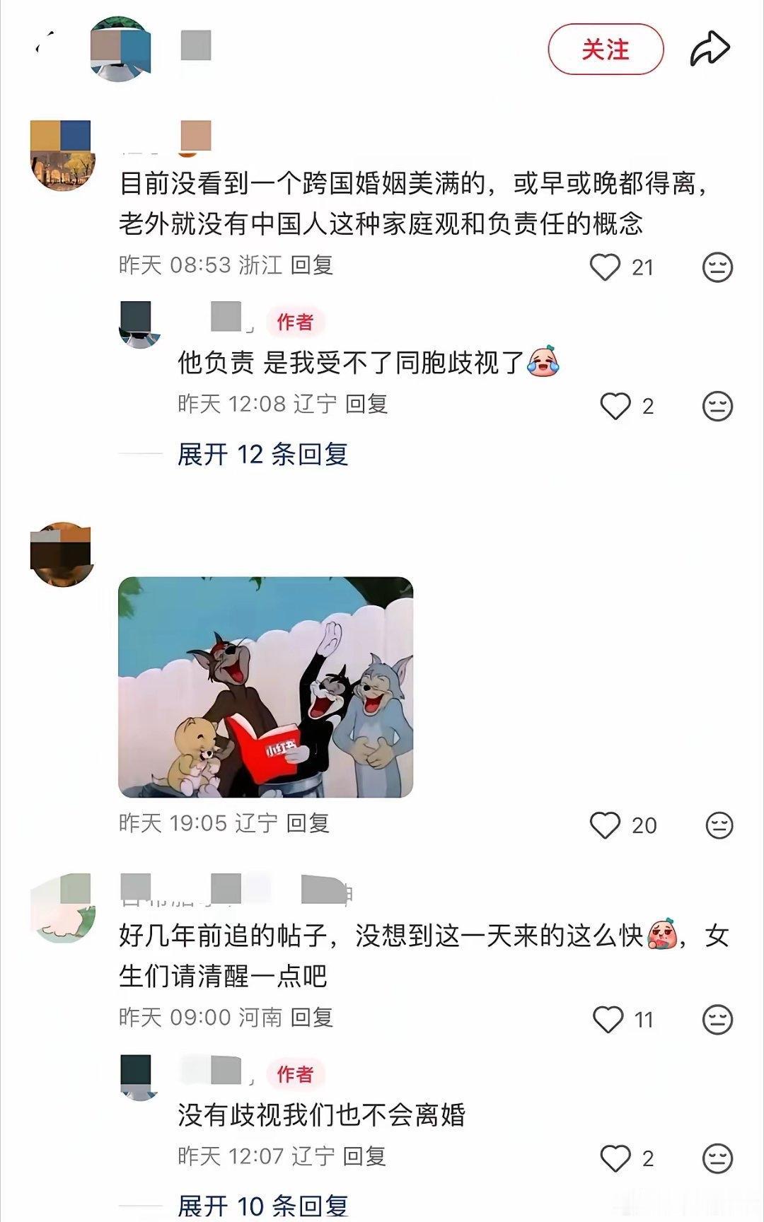 一个小仙女和结婚 4 年的外国老公离婚了,她把这这归咎于国人的歧视导致她的婚姻破裂。想当初她结婚时曾经发下誓言,要陪她的外国老公走过无数个春夏秋冬,可是现实却被狠狠打脸。 跨国的恋情可以很浪漫很美好,但一旦走入婚姻,进入日常的柴米油盐。往往一地鸡毛,因为生活习惯,饮食禁忌,还有价值观方面的磨合就成为巨大的问题。这些分歧如果不能妥善的解决,就会成为吵架撕 逼的导火索。往往很多外国男人在结婚前表现的绅士包容,可结婚后他们就是另一副嘴脸,大男子主义,不负责任,双手一摊,认为全都是女生的错。这让女生会产生巨大的心理落差,时间久了激情消退,必然就是走向分手。跨国的婚姻,各位小仙女们一定要谨慎。