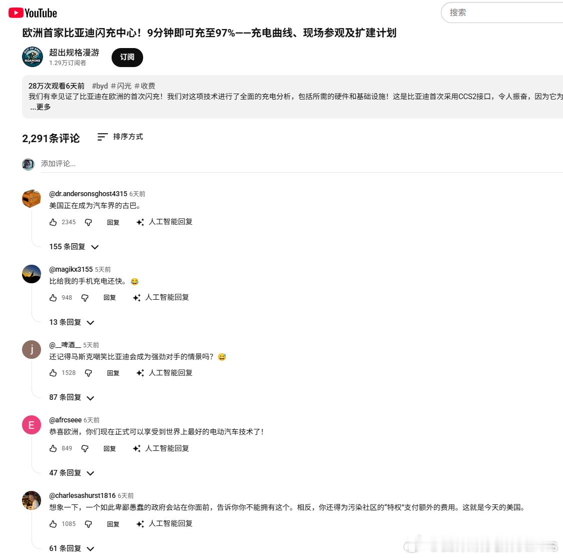 科技出海迎来新阶段,咱们在汽车这个最重要的品类上,开始获得全球人民的技术崇拜了!我真的从未见过这么一边倒的评论,闪充直接把他们的心理防线打崩了,开始反思自己国家的制度,觉得自己封闭落后了。这场面,哪怕倒推三年,我都完全不敢想。一直看、一直爽,成了、成了。大v聊车