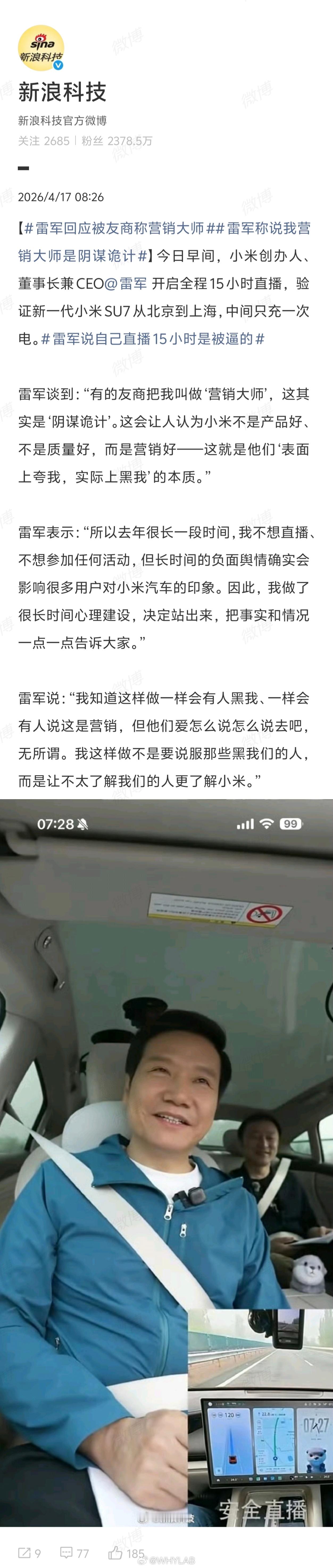 “所以去年很长一段时间,我不想直播、不想参加任何活动,但长时间的负面舆情确实会影响很多用户对小米汽车的印象。因此,我做了很长时间心理建设,决定站出来,把事实和情况一点一点告诉大家。”