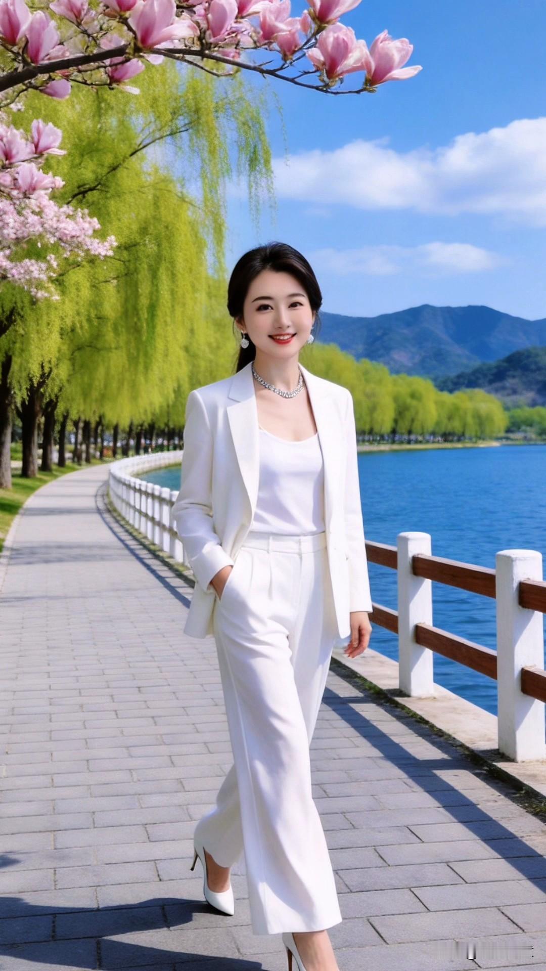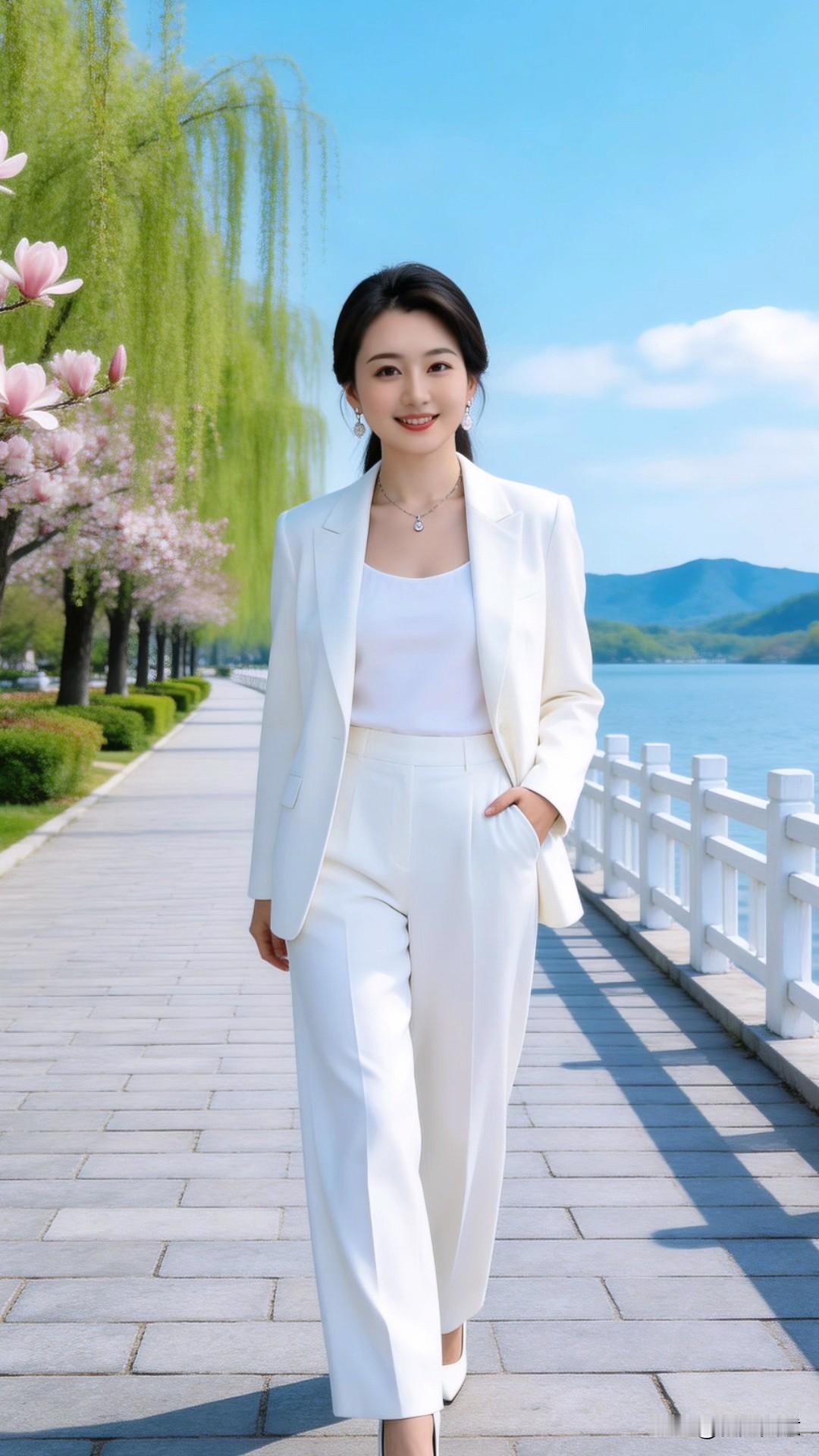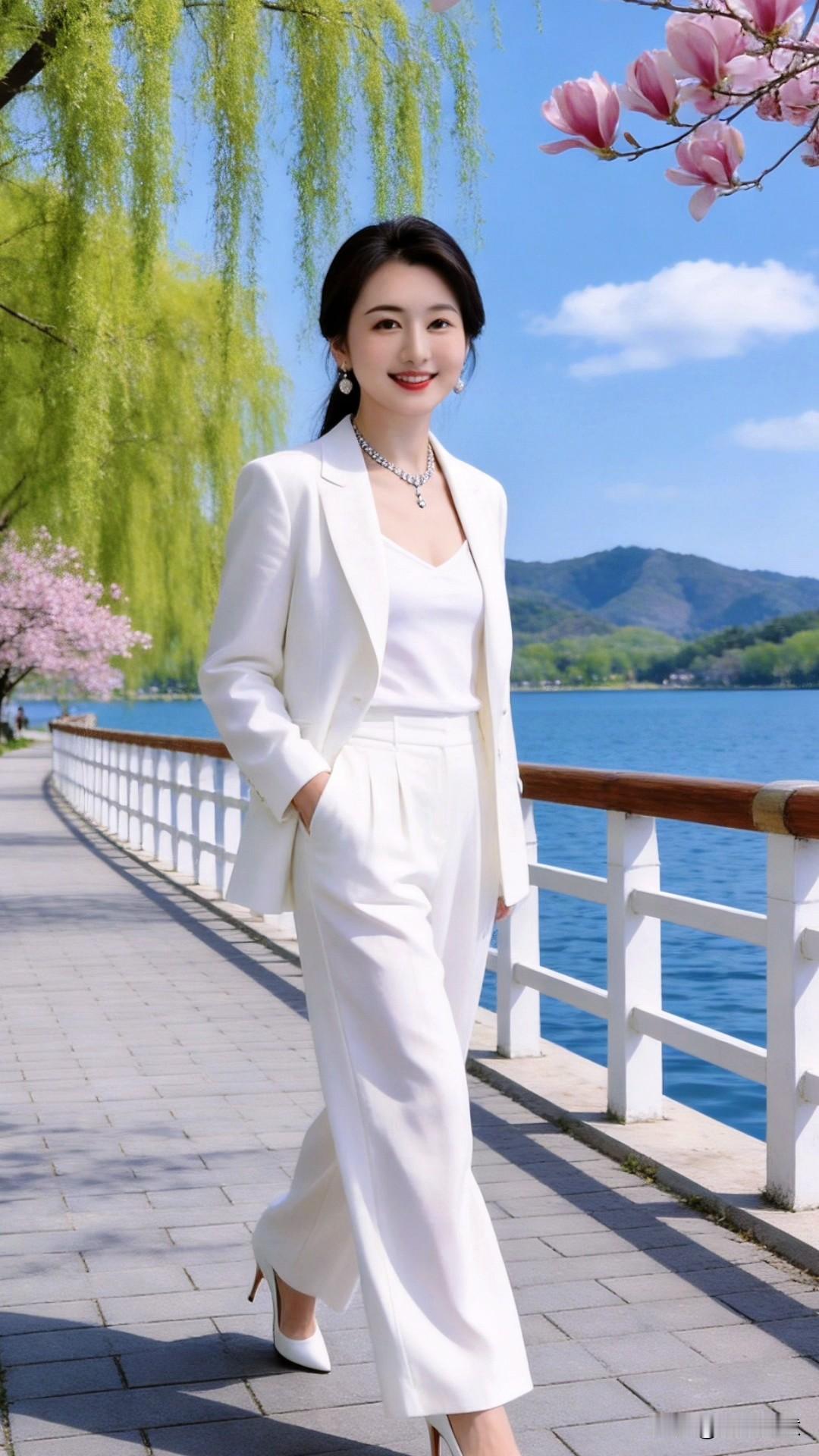 今天穿了一身清爽的白色西装套装,漫步在春日湖畔。玉兰花开得正好,柳丝拂过肩头,湖水泛着粼粼波光,连风都带着温柔的气息。一身简洁的全白装扮,堪称春日里最纯净的浪漫,将职场的干练与生活的松弛感,都完美地穿在了身上春日穿搭 白色西装 氛围感穿搭 气质通勤白衬衫