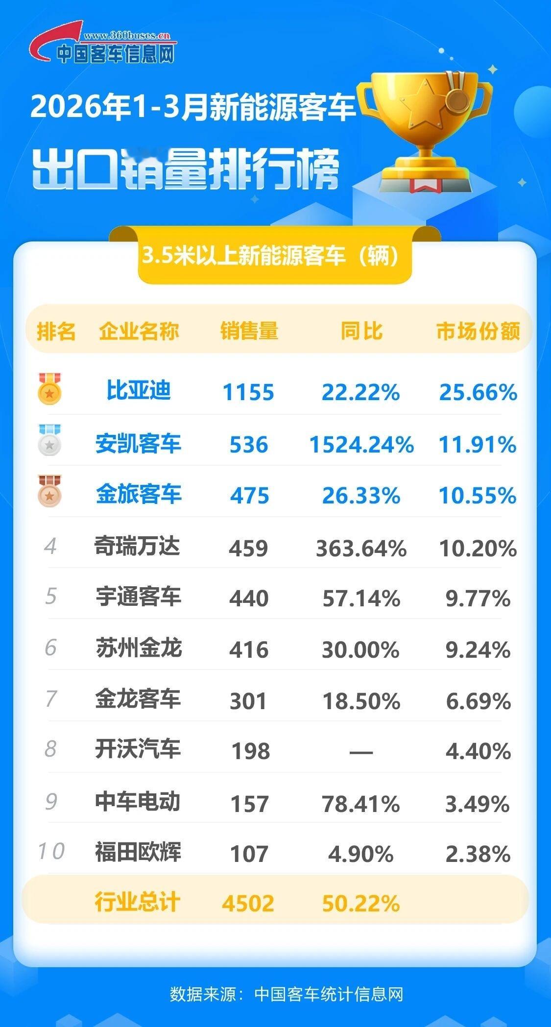 比亚迪不只是乘用车卖的好,商用车也是市场领先,很多地方的新能源公交车和大巴都是比亚迪。今年一季度,比亚迪新能源客车出口再次位列第一,市场份额25.66%,是行业唯一新能源客车出口超1000辆的企业,更是连续三年蝉联新能源客车出口冠军。