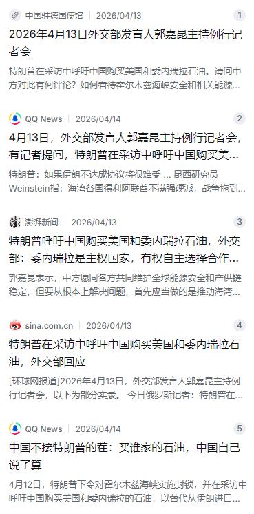 特朗普给中国两条路,中国一条都不选! 4 月 13 日,中国外交部发言人郭嘉昆表示:"委内瑞拉是主权国家,他们可以自主选择合作对象!不需要别国指手画脚!" 麻烦看官老爷们右上角点击一下“关注”,既方便您进行讨论和分享,又能给您带来不一样的参与感,感谢您的支持! 4月13日这天,外交部发言人郭嘉昆在例行记者会上碰到了一个挺棘手的问题。今日俄罗斯记者提了个事儿:美国前总统特朗普一边下令封锁霍尔木兹海峡,一边在采访里喊话中国,让中国买美国和委内瑞拉的石油来替代从伊朗进口。这摆明了是给中国出选择题,而且是个二选一、怎么选都有坑的选择题。 可中国的回答干脆利落:这题我不做。 先说第一个选项:买美国石油。特朗普之所以这么喊,逻辑其实不复杂——封锁霍尔木兹海峡,伊朗的石油就运不出来,油价必然上涨。他以为中国是能源进口大国,离开伊朗的石油会很难受,正好趁机让中国转向美国石油,既帮美国能源商打开市场,又能在地缘政治上卡中国的脖子。这话说得挺漂亮,但仔细一想,美国想让中国买什么中国就买什么?哪有这么便宜的事。 再来看第二个选项:买委内瑞拉石油。这个选项更毒。美国当时已经在委内瑞拉搞了不少动作,甚至放话说中俄只能在美方控制下购买委内瑞拉原油。说白了,这就是想拿委内瑞拉的石油资源当筹码,逼中国乖乖听话。但委内瑞拉是主权国家,它把石油卖给谁、跟谁合作,那是人家自己的事,你美国凭什么替人家做主? 面对这种局面,郭嘉昆的回应可以说是既客气又有骨气。他没有直接跟特朗普吵,而是分两层把话说清楚了。 第一层,关于霍尔木兹海峡。郭嘉昆说,霍尔木兹海峡是重要的国际能源通道,维护安全畅通符合国际社会的共同利益。他没有把矛头指向美国,也没有指责伊朗,而是直接点出了一个谁都回避不了的事实——海峡通航受阻的根源在于伊朗战事,解决问题的出路是尽快停火止战。这话翻译过来就是:你美国别光想着封锁海峡、让别人买你的油,你先想办法把中东的战火停下来。停不了火,你喊什么买油? 第二层,关于委内瑞拉。郭嘉昆的原话是:“委内瑞拉是主权国家,对本国的自然资源和一切经济活动拥有充分的永久主权,有权自主选择合作对象,其他国家无权指手画脚。”这话说得相当直白。委内瑞拉不是美国的附属国,它想跟谁合作就跟谁合作,中国想买谁家的油就买谁家的油,轮不到特朗普在旁边指手画脚。 其实这已经不是美国第一次在委内瑞拉问题上对中国发难了。早在2026年1月,特朗普就在白宫跟石油行业高管放话,说中俄只能在美方控制下购买委内瑞拉原油,还威胁说如果美国不接管委内瑞拉的石油产业,中俄就会接手。当时外交部发言人毛宁的回应也很干脆:拉美国家都是主权独立国家,有权自主选择合作伙伴,中国跟委内瑞拉的合作是主权国家之间的合作,受国际法和两国法律保护。现在到了4月,特朗普换了个花样,把委内瑞拉和霍尔木兹海峡绑在一起,但中国的立场始终没变。 再说说特朗普那个封锁霍尔木兹海峡的狠招。这个招数确实够狠,因为霍尔木兹海峡是全球能源运输的咽喉要道,全球五分之一的石油都要从这里经过。美国中央司令部从4月13日上午10点起正式对进出伊朗港口的所有海上交通实施封锁。这直接冲击了中国的能源进口,因为中国有将近一半的海运原油都要经过霍尔木兹海峡运输。 那中国是不是就没办法了?也不是。中国的能源进口早就不是单吊在一个地方了。早在战争爆发前,中国就已经在大力推动能源来源的多元化布局。2026年1月的数据显示,中国从沙特进口的原油占进口总量的16%,从俄罗斯进口的占15.4%,从巴西进口的占12%。这些数字说明,中国对中东地区的依赖虽然在,但远没到离了它就活不了的地步。 再说伊朗这条线。中国是伊朗石油的最大买家,去年购买了超过80%的伊朗出口原油,日均进口约138万桶,占中国海运原油进口总量的13.4%左右。但这个比例也在逐年下降。有分析指出,伊朗石油在中国石油进口中的账面占比大概在13%到20%之间,考虑到一些非正式渠道,实际比例可能更高,但中国一直在主动降低这个占比。 除了来源多元化,中国在新能源领域的布局也为能源安全提供了另一层保障。中国在光伏、风电、电动汽车等领域已经是全球领先,对化石能源的依赖程度正在逐步降低。虽然在短期内还无法完全替代石油进口,但长期来看,这种结构性转型正在增强中国抵御能源风险的能力。 另外值得一提的是,特朗普这个封锁招数能不能真的执行到位,其实要打个问号。有分析指出,美国并不希望进一步扩大冲突范围,更不愿把中国卷进来,尤其是在特朗普计划5月中旬访华的背景下。而且,伊朗的原油出口在战争爆发后不但没有减少,反而还在增加,3月份日均出口达到了184万桶,比去年全年的平均水平还高。这说明封锁的效果未必像特朗普想象的那么立竿见影。