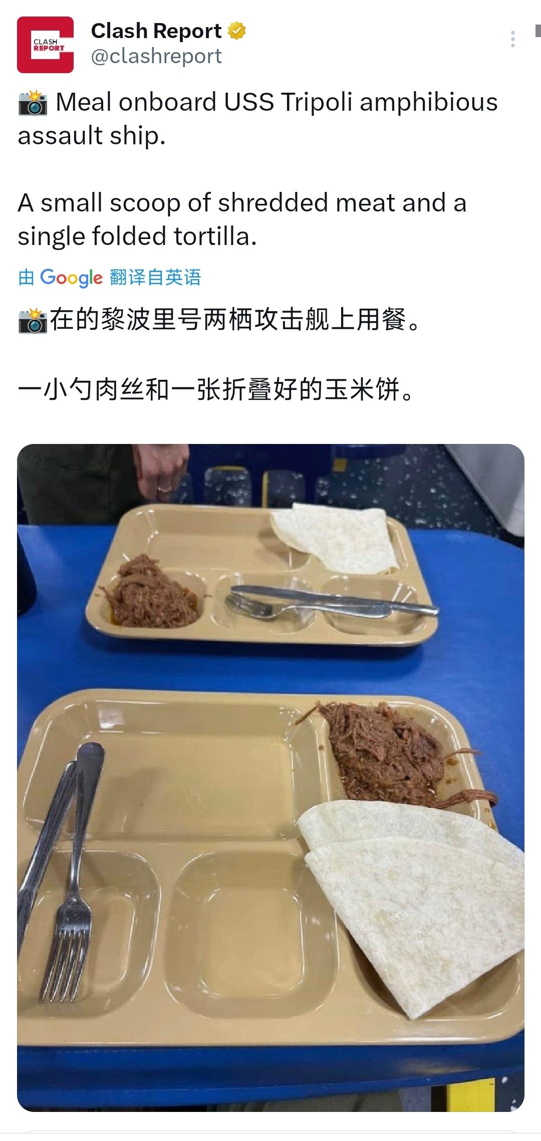 图一:“的黎波里”号两栖攻击舰的餐食; 图二:“亚伯拉罕·林肯”号航空母舰的餐食。 图二那个长方形的玩意,究竟是什么?