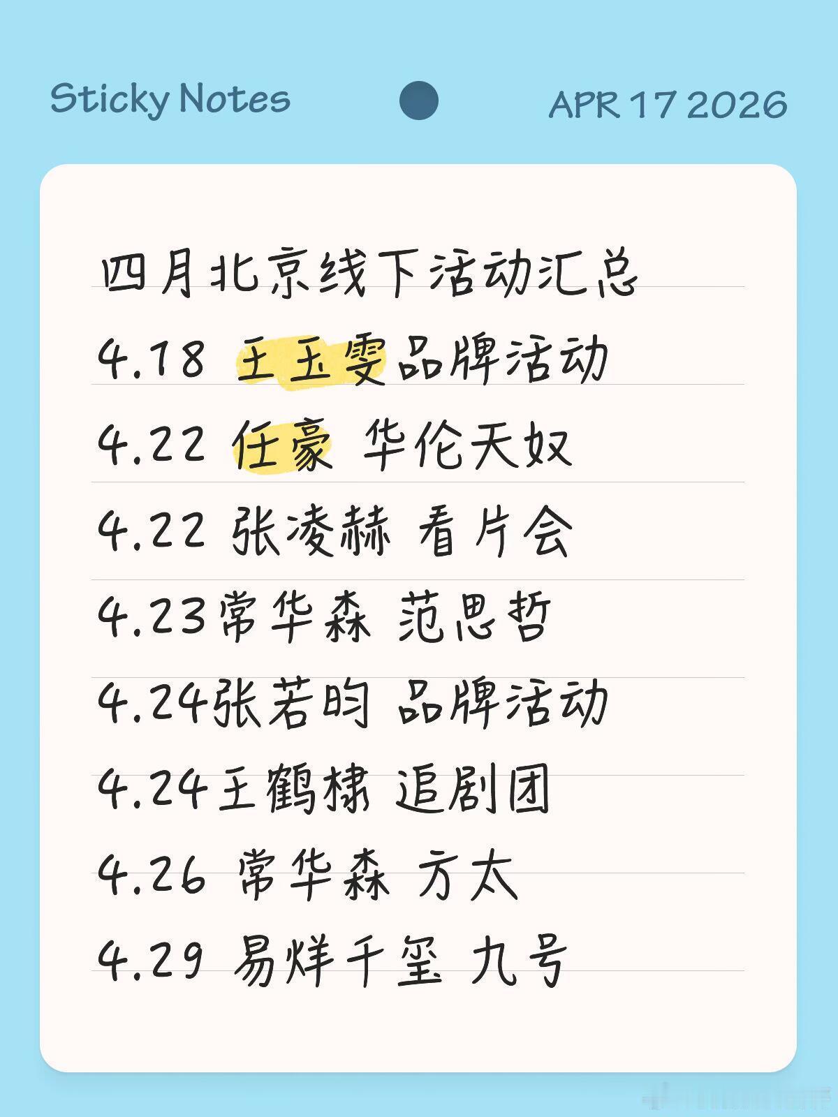 四月北京线下活动汇总4.18 王玉雯品牌活动4.22 任豪 华伦天奴4.22 张凌赫 看片会4.23常华森 范思哲4.24张若昀 品牌活动4.24王鹤棣 追剧团4.26 常华森方太4.29 易烊干玺九号
