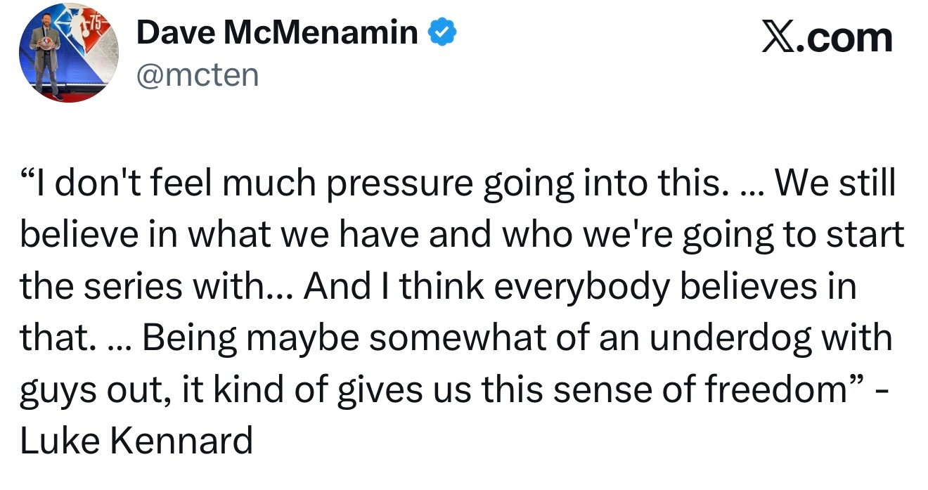 肯纳德谈对阵火箭的季后赛:“我对此并没有感到太大压力……我们依然相信我们所拥有的阵容,也相信我们将以这套阵容开启系列赛……我觉得每个人都对此抱有信心……在缺少队友的情况下,我们或许处于某种劣势,但这反而给了我们一种自由感。”