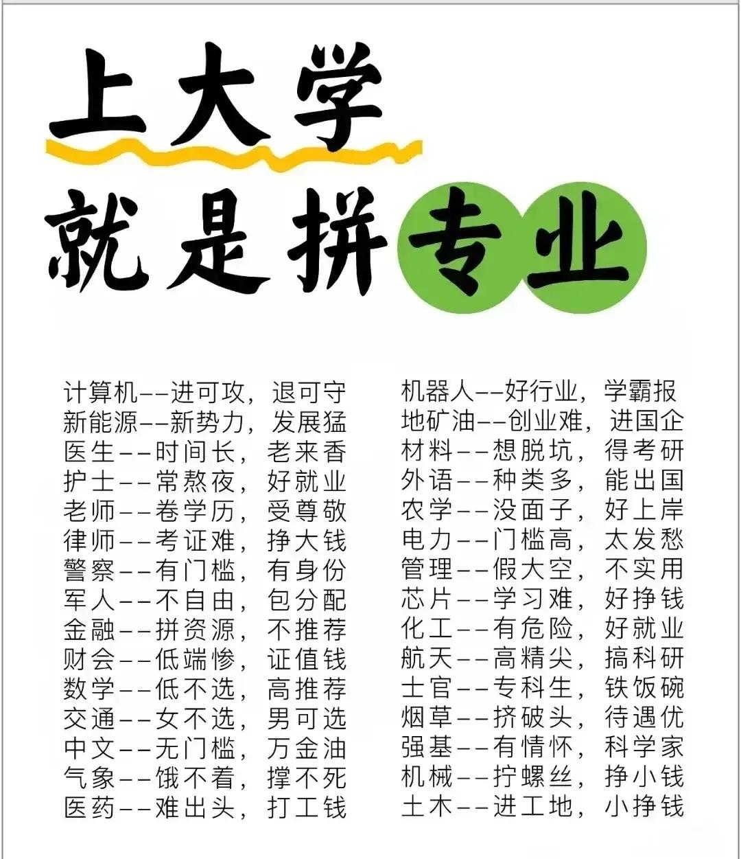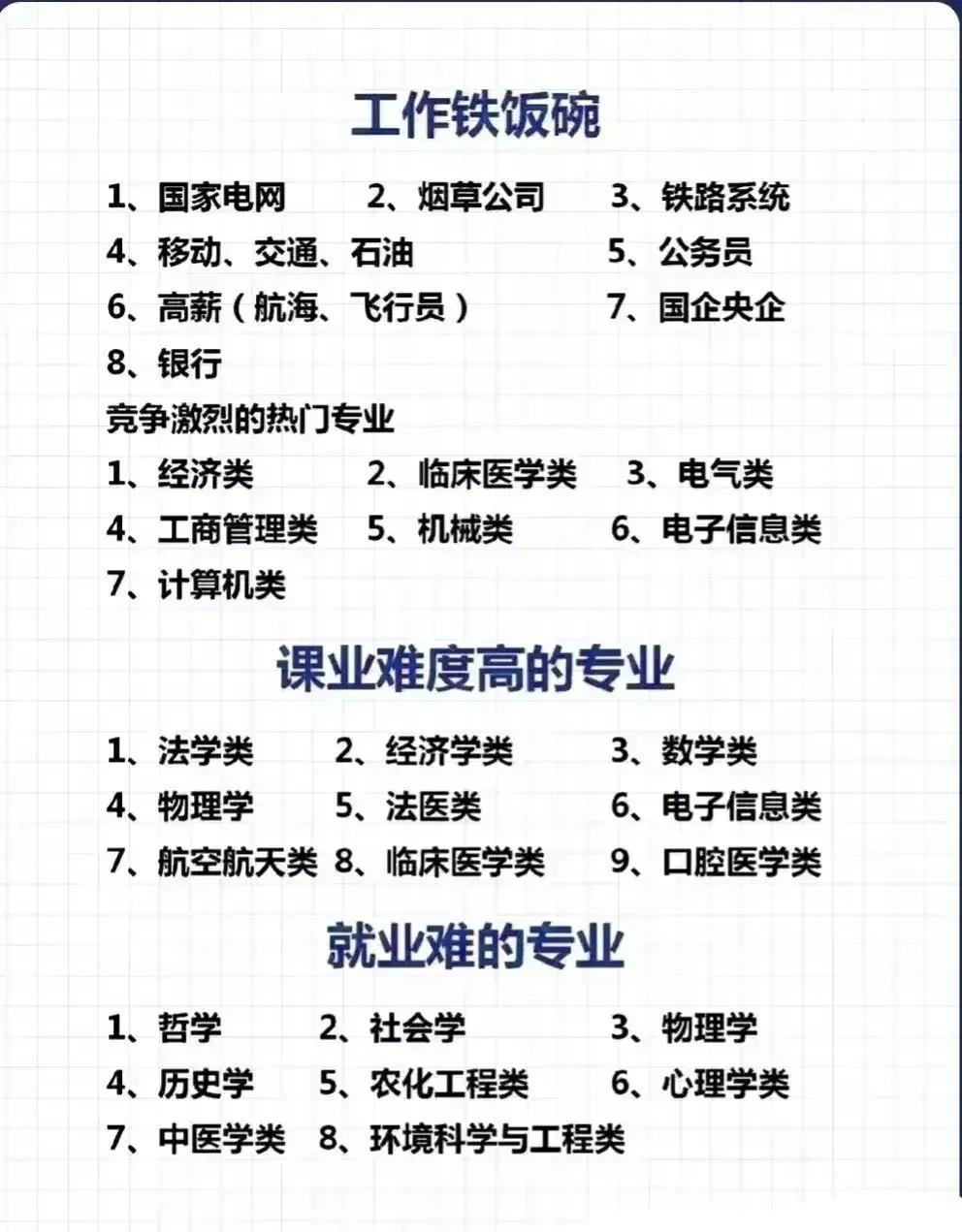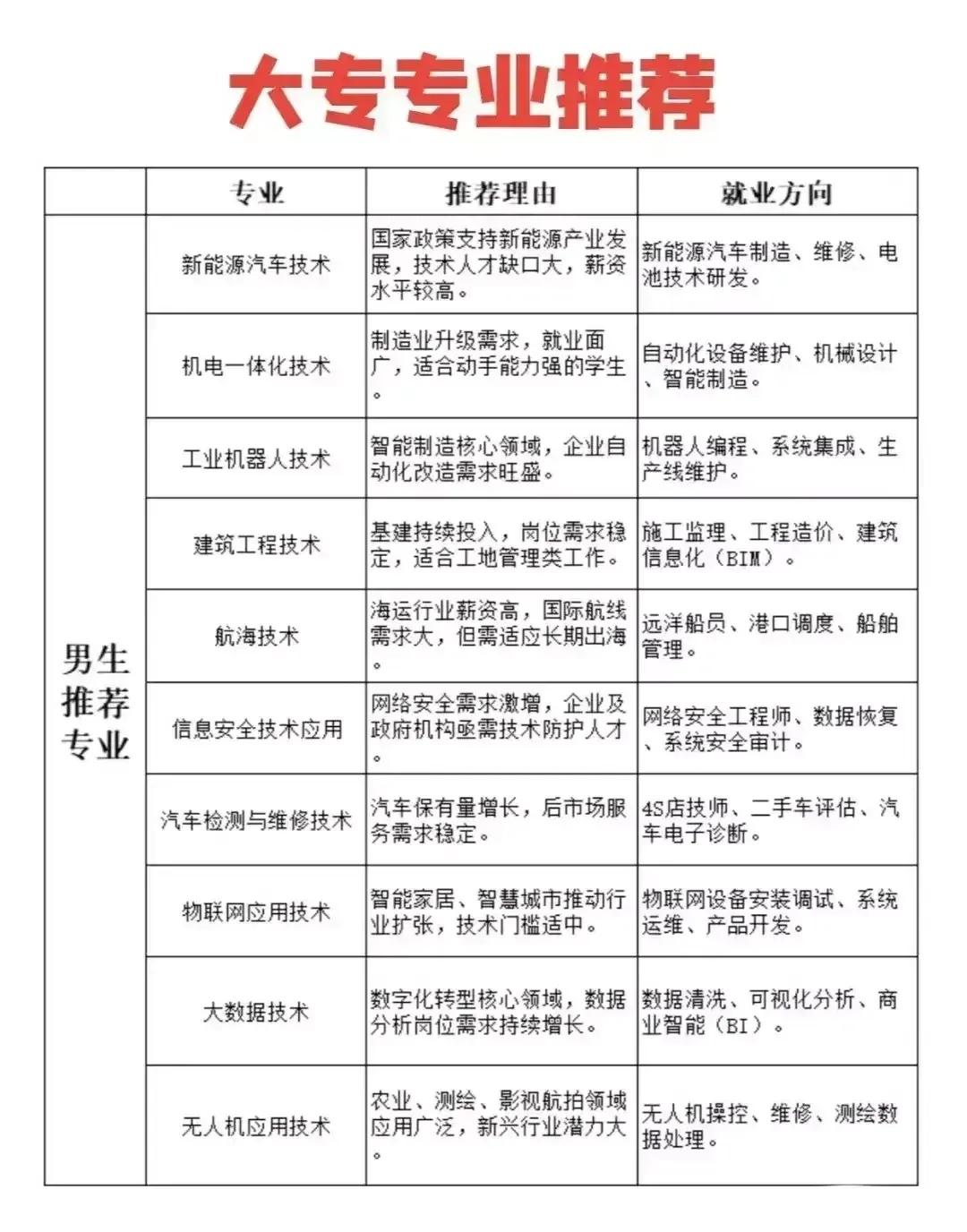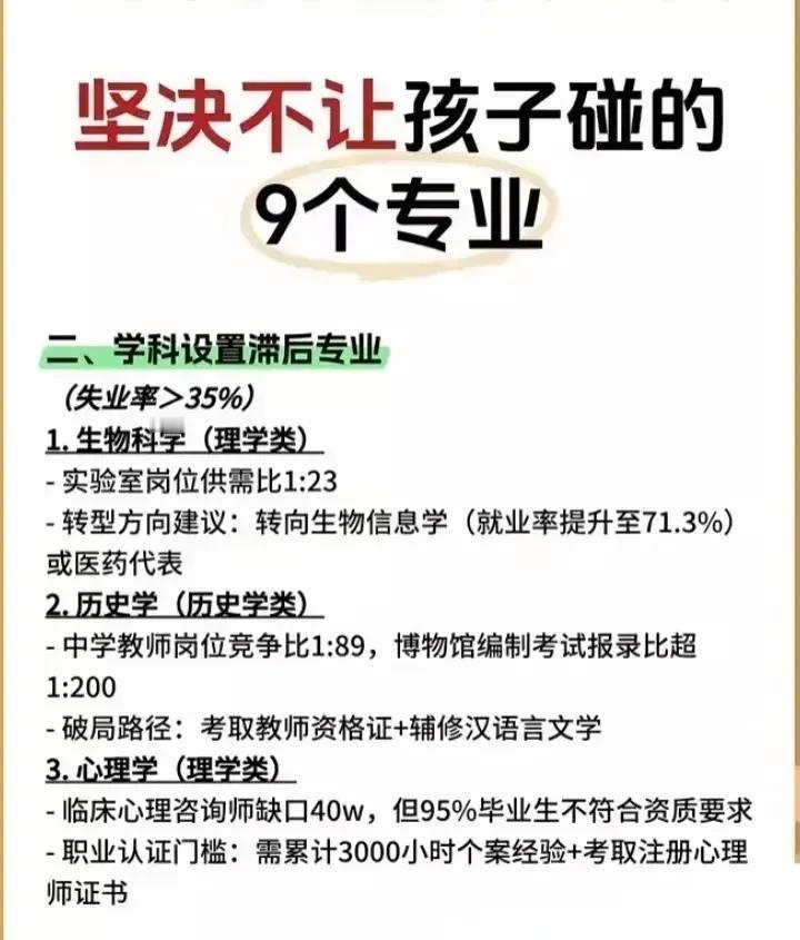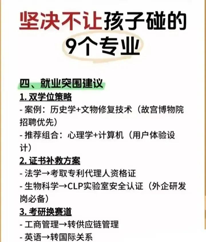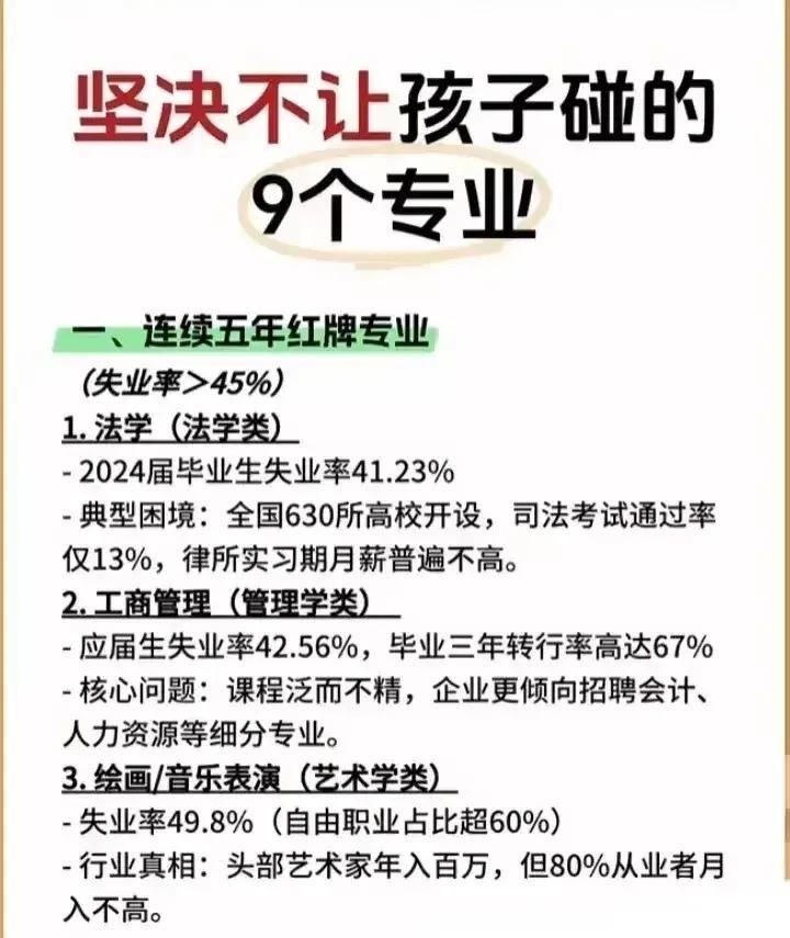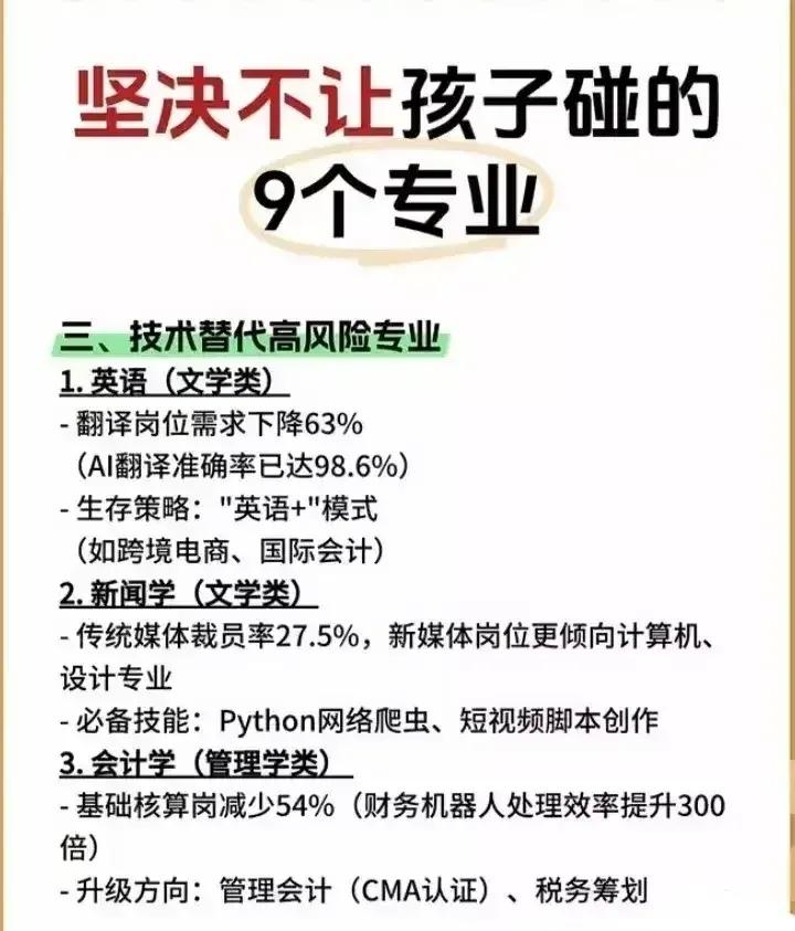 志愿填报别踩坑!9个专业坚决不让孩子碰。“男怕入错行,女怕嫁错郎!”高考志愿填报真的是三分考、七分报,选对专业少走十年弯路!这份登上头条热搜的专业避坑+报考指南,从避雷清单到精准推荐全覆盖,家长和考生赶紧码住! 这些专业坚决别碰!9个高失业“雷区”预警: - 红牌专业TOP3:法学(司法考试通过率仅13%)、工商管理(转行率67%)、绘画/音乐表演(失业率近50%); - 学科滞后专业:生物科学(实验室岗位供需比1:23)、历史学(教师岗竞争1:89)、心理学(95%毕业生不符从业资质); - 技术替代高危专业:英语(翻译岗需求降63%)、新闻学(传统媒体裁员27.5%)、会计学(基础岗减54%)。 不同需求精准选专业,男女适配更靠谱: - 理科女生优选:金融、口腔医学、师范、大数据、数字媒体技术; - 理科男生首选:计算机、电子信息、人工智能、新能源、电气类; - 铁饭碗专业:公安司法类、师范类、医护类、烟草、国家电网、央企国企相关专业。 大专生别盲目!推荐+避雷清单一目了然: ✅ 女生推荐:护理、学前教育、眼视光技术、宠物医疗技术; ✅ 男生推荐:新能源汽车技术、工业机器人、信息安全、大数据技术; ❌ 避坑预警:法律事务、市场营销、生物技术、工商企业管理、应用英语。 志愿填报10大铁律记牢:普通家庭优先医学/师范/军校,富裕家庭可选金融经济,不读研别碰生化环材,名校优先选热门工科,普通院校慎选经管类! 专业没有绝对好坏,关键是匹配自身兴趣、能力和家庭资源。比如英语+跨境电商、历史学+文物修复,冷门专业也能玩出新出路。你家孩子是理科还是文科?想冲热门还是求稳定?欢迎评论区留言交流。