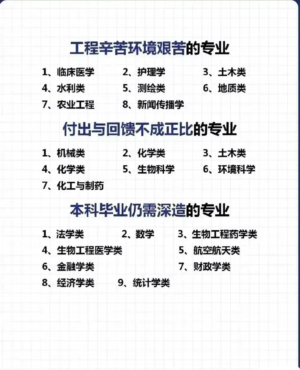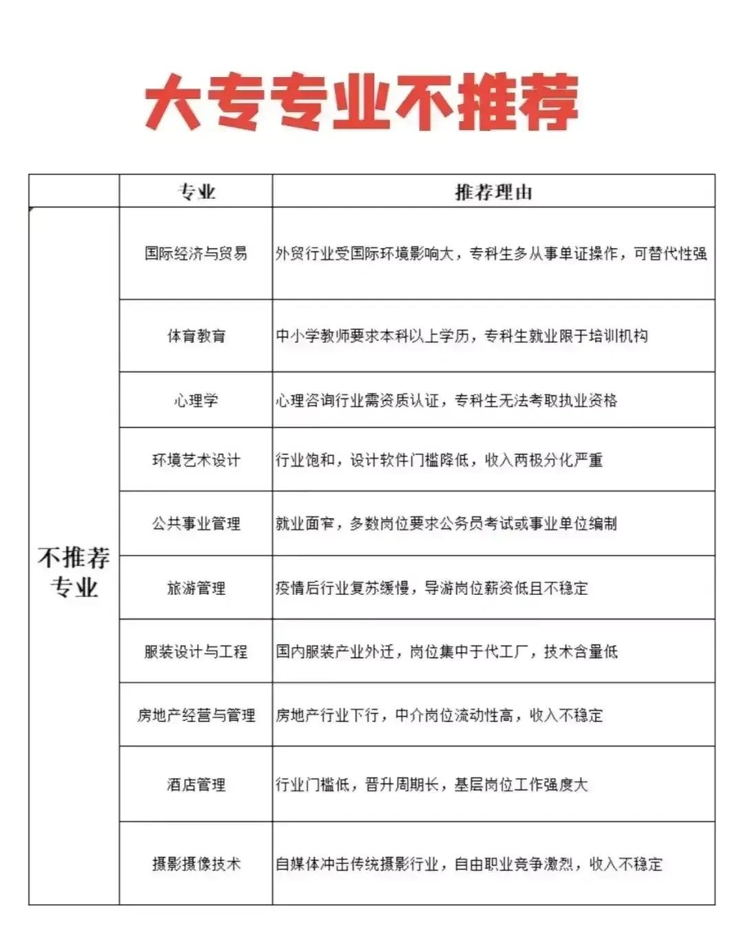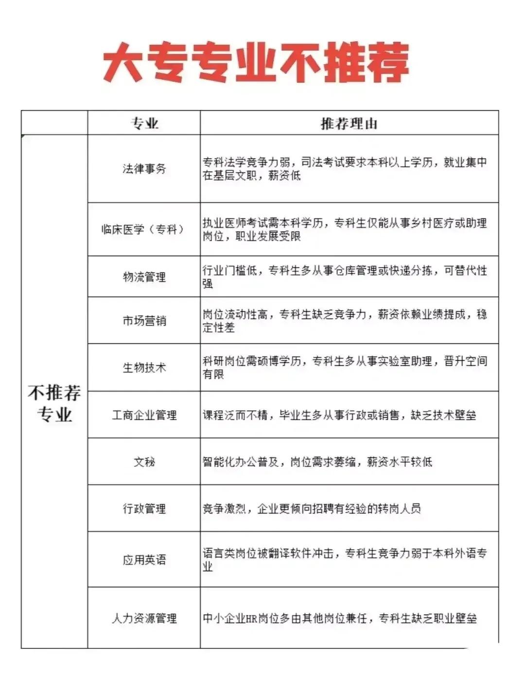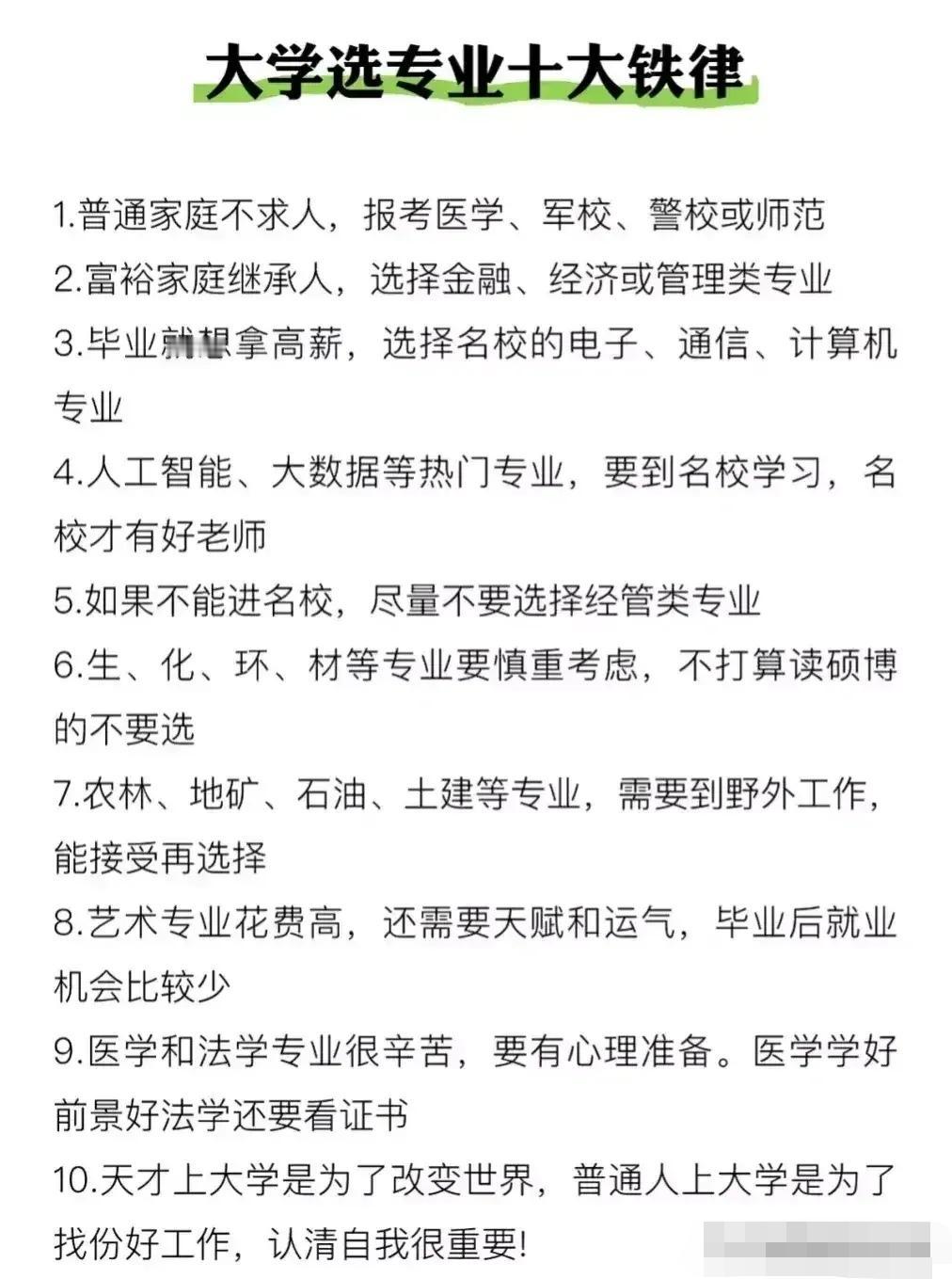 志愿填报别踩坑!9个专业坚决不让孩子碰。“男怕入错行,女怕嫁错郎!”高考志愿填报真的是三分考、七分报,选对专业少走十年弯路!这份登上头条热搜的专业避坑+报考指南,从避雷清单到精准推荐全覆盖,家长和考生赶紧码住! 这些专业坚决别碰!9个高失业“雷区”预警: - 红牌专业TOP3:法学(司法考试通过率仅13%)、工商管理(转行率67%)、绘画/音乐表演(失业率近50%); - 学科滞后专业:生物科学(实验室岗位供需比1:23)、历史学(教师岗竞争1:89)、心理学(95%毕业生不符从业资质); - 技术替代高危专业:英语(翻译岗需求降63%)、新闻学(传统媒体裁员27.5%)、会计学(基础岗减54%)。 不同需求精准选专业,男女适配更靠谱: - 理科女生优选:金融、口腔医学、师范、大数据、数字媒体技术; - 理科男生首选:计算机、电子信息、人工智能、新能源、电气类; - 铁饭碗专业:公安司法类、师范类、医护类、烟草、国家电网、央企国企相关专业。 大专生别盲目!推荐+避雷清单一目了然: ✅ 女生推荐:护理、学前教育、眼视光技术、宠物医疗技术; ✅ 男生推荐:新能源汽车技术、工业机器人、信息安全、大数据技术; ❌ 避坑预警:法律事务、市场营销、生物技术、工商企业管理、应用英语。 志愿填报10大铁律记牢:普通家庭优先医学/师范/军校,富裕家庭可选金融经济,不读研别碰生化环材,名校优先选热门工科,普通院校慎选经管类! 专业没有绝对好坏,关键是匹配自身兴趣、能力和家庭资源。比如英语+跨境电商、历史学+文物修复,冷门专业也能玩出新出路。你家孩子是理科还是文科?想冲热门还是求稳定?欢迎评论区留言交流。