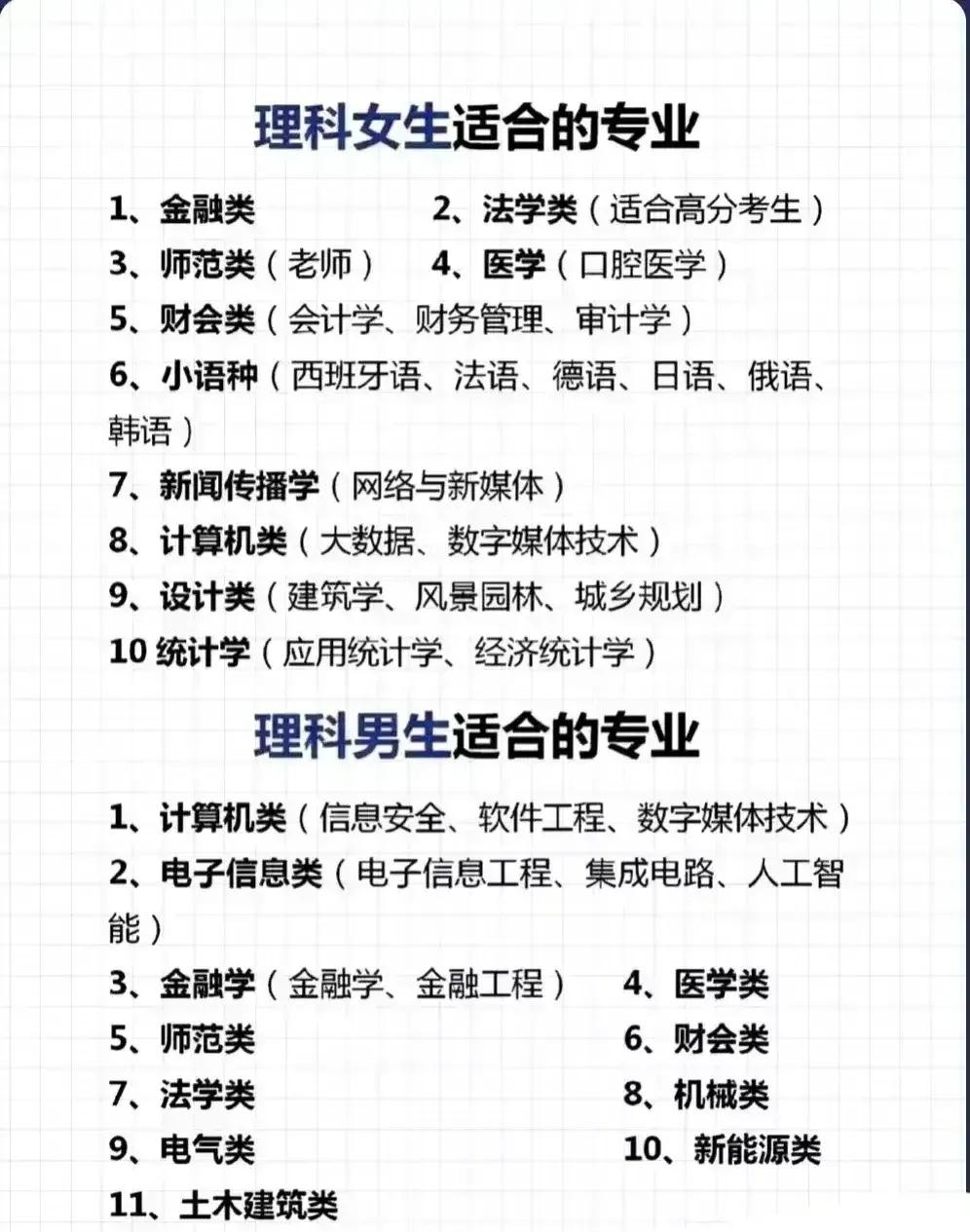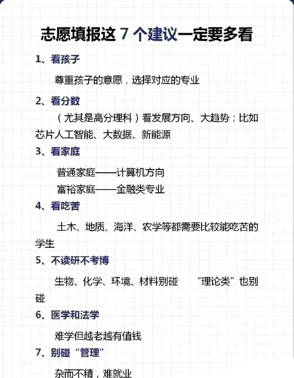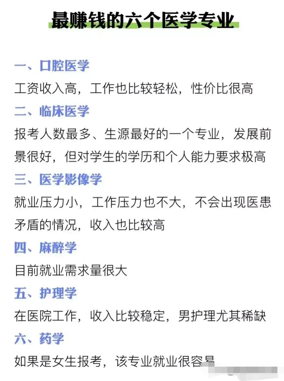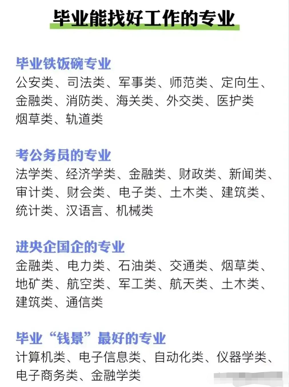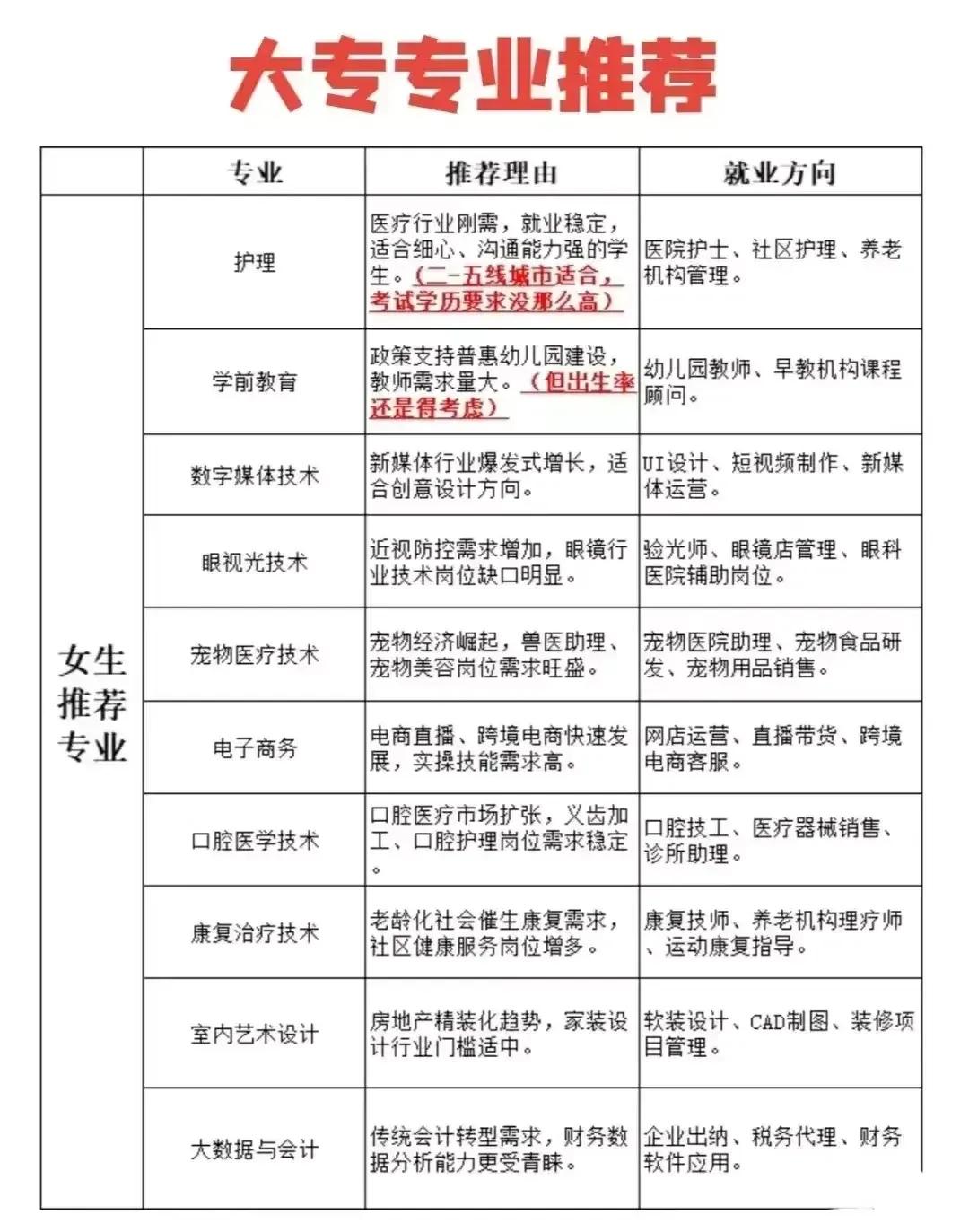 志愿填报别踩坑!9个专业坚决不让孩子碰。“男怕入错行,女怕嫁错郎!”高考志愿填报真的是三分考、七分报,选对专业少走十年弯路!这份登上头条热搜的专业避坑+报考指南,从避雷清单到精准推荐全覆盖,家长和考生赶紧码住! 这些专业坚决别碰!9个高失业“雷区”预警: - 红牌专业TOP3:法学(司法考试通过率仅13%)、工商管理(转行率67%)、绘画/音乐表演(失业率近50%); - 学科滞后专业:生物科学(实验室岗位供需比1:23)、历史学(教师岗竞争1:89)、心理学(95%毕业生不符从业资质); - 技术替代高危专业:英语(翻译岗需求降63%)、新闻学(传统媒体裁员27.5%)、会计学(基础岗减54%)。 不同需求精准选专业,男女适配更靠谱: - 理科女生优选:金融、口腔医学、师范、大数据、数字媒体技术; - 理科男生首选:计算机、电子信息、人工智能、新能源、电气类; - 铁饭碗专业:公安司法类、师范类、医护类、烟草、国家电网、央企国企相关专业。 大专生别盲目!推荐+避雷清单一目了然: ✅ 女生推荐:护理、学前教育、眼视光技术、宠物医疗技术; ✅ 男生推荐:新能源汽车技术、工业机器人、信息安全、大数据技术; ❌ 避坑预警:法律事务、市场营销、生物技术、工商企业管理、应用英语。 志愿填报10大铁律记牢:普通家庭优先医学/师范/军校,富裕家庭可选金融经济,不读研别碰生化环材,名校优先选热门工科,普通院校慎选经管类! 专业没有绝对好坏,关键是匹配自身兴趣、能力和家庭资源。比如英语+跨境电商、历史学+文物修复,冷门专业也能玩出新出路。你家孩子是理科还是文科?想冲热门还是求稳定?欢迎评论区留言交流。